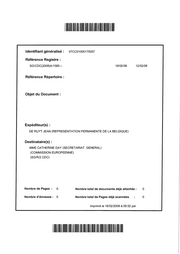 "content": "I I I I I I I I I I I I I I I I I I I I Il 1 1 1 1 1 1 1 1 1 ldentifiant generalise : 07CC01000175057 Reference Registre : SG/CDC(2008)A/1585.-- 18/02/08 12/02/08 Reference Repertoire : Objet du Document : Expediteur(s) : DE RUYT JEAN (REPRESENTATION PERMANENTE DE LA BELGIQUE) Destinataire(s) : MME CATHERINE DAY (SECRETARIAT GENERAL) (COMMISSION EUROPEENNE) (SG/R/2 CDC) Nombre de Pages : O Nombre total de documents deja attaches : 0 Nombre d'Annexes : 0 Nombre total de Pages deja scannees 0 lmprime le 18/02/2008 a 09:32 par I I I I I I I I I I I I I I I I I I I I I I I I I I I I II I I I II I I I I I",