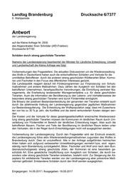 "content": "Landtag Brandenburg Drucksache 6/7377 6. Wahlperiode Antwort der Landesregierung auf die Kleine Anfrage Nr. 2935 des Abgeordneten Sven Schröder (AfD-Fraktion) Drucksache 6/7150 Schäden durch streng geschützte Tierarten Namens der Landesregierung beantwortet der Minister für Ländliche Entwicklung, Umwelt und Landwirtschaft die Kleine Anfrage wie folgt: Vorbemerkungen des Fragestellers: Die aktuellen Diskussionen um die Wiederansiedlung des Wolfs in Deutschland haben auch die wirtschaftlichen Schäden und Verluste für die unmittelbar Betroffenen durch die anderen streng geschützten Wildtierarten Biber, Kormo- ran und Fischotter in den Focus des öffentlichen Interesses gerückt. Die Landespolitik reagiert darauf mit Förderprogrammen zur Finanzierung von Schutz- maßnahmen und andere Maßnahmen. Dazu zählen der Ausgleich von Schäden bei den betroffenen Unternehmen, tierartspezifische Verordnungen, die Einrichtung zentraler Ma- nagements, die Erarbeitung landesweiter Managementpläne u.a. für diese geschützten Tierarten. Auch die Information der Bevölkerung zu den Lebens- und Verhaltensweise der besonders streng geschützten Tierarten wird durch Fördermittel ermöglicht. Die Brisanz der positiven Bestandsentwicklung der genannten vier Tierarten entsteht auch durch die ablehnende Haltung der Landesregierung gegenüber jagdlichen Maßnahmen zur Bestandsregulierung. Die Entwicklung der Wolfspopulation zeigt, dass mit Zuwachsra- ten von bis zu 30 % je Jahr, die Konflikte und die damit verbundenen Kosten steigen wer- den. Die Kosten und die Verluste für diese gesamtgesellschaftlich erwünschte Wiederansied- lung streng geschützter Tierarten müssen die Kommunen im ländlichen Raum durch Um- verteilung von Fördermittel im Bereich der ländlichen Entwicklung tragen. Aber auch die betroffenen Bauern, Fischer und Teile der Bevölkerung im ländlichen Raum leiden unter den Verlusten, die in der Regel durch Entschädigungen nicht voll ausgeglichen werden. Vorbemerkung der Landesregierung: Durch den Fragesteller wird der Eindruck erweckt, die Landesregierung führe aktiv Wiederansiedlungsmaßnahmen zugunsten des Wolfes in Brandenburg durch. Dies ist unzutreffend. Alle in der Anfrage aufgeführten heimischen Arten haben sich aufgrund verbesserter Umweltbedingungen vermehrt bzw. sind eigen- ständig nach Brandenburg zurückgekehrt. Biber, Fischotter und Wolf sind nach dem Bun- desnaturschutzgesetz streng geschützte Arten, der Kormoran ist eine besonders ge- schützte Art. Eine gesetzliche Verpflichtung zum Ausgleich von Schäden, die durch be- sonders oder streng geschützte Tierarten entstehen, besteht nicht. Zur Steigerung der Ak- zeptanz für wildlebende Tierarten werden von der Landesregierung aber präventive Maß- nahmen gefördert. Entstandene Schäden durch den Wolf werden ausgeglichen. Eingegangen: 14.09.2017 / Ausgegeben: 19.09.2017",