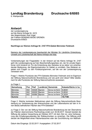 "content": "men auf den in ihren Besitz befindlichen Flächen. Mit Hilfe eines Flächentausches könnte ein großer Anteil der im Bewirtschaftungserlass vorgeschriebenen Pufferstrei- fen gesichert werden. Wenn sich die Stiftung Naturschutzfonds auf ihre Flächen be- schränkt, wird sie eine Umwandlung in Dauergrünland vornehmen und vorhandene Drainagen entfernen. Somit soll das Wasserdargebot in den Kleingewässern auf den Stiftungsflächen verbessert und die Nährstoffzufuhr reduziert werden. Frage 3: Befinden sich BVVG-Flächen in dem FFH-Gebiet und bis wann sind diese verpachtet? Bitte tabellarisch für alle Flurstücke im Eigentum der BVVG ausweisen. zu Frage 3: Im FFH-Gebiet liegen rund 70 Hektar BVVG-Flächen (siehe Tabelle 1). Die Flächen sind nach Informationen des Landesamtes für Umwelt (LfU) bis zum 30.09.2019 verpachtet. Frage 4: Sind Veräußerungen von BVVG-Flächen in dem FFH-Gebiet geplant? Falls ja, für welche Flächen und wann? zu Frage 4: Hierzu liegen keine Informationen vor. Frage 5: Welche Konsequenzen ergeben sich für die BVVG aus dem FFH-Status im Umgang mit den Flächen? zu Frage 5: Die BVVG hat keine weitergehenden Verpflichtungen zur Bewirtschaf- tung der Flächen als ein privater Eigentümer. Frage 6: Für welchen Anteil des FFH-Gebietes stellt der Bewirtschaftungserlass den günstigen Erhaltungszustand des Gebietes durch eine verbindliche Wirkung auf den Nutzer sicher? zu Frage 6: Der Bewirtschaftungserlass ist im Geschäftsbereich des Ministeriums für Ländliche Entwicklung, Umwelt und Landwirtschaft (MLUL) behördenverbindlich. Für die im Gebiet wirtschaftenden Eigentümer und Nutzer sind die fachgesetzlichen Bestimmungen einzuhalten. Die Umsetzung der im Bewirtschaftungserlass genann- ten darüber hinaus gehenden Maßnahmen erfolgt ggf. freiwillig mittels Förderverträ- gen (siehe auch Antwort zu den Fragen 9, 12 und 14). Frage 7: Wie nimmt das Land Brandenburg seine Fachaufsicht über die Unteren Na- turschutzbehörden war, die für die Umsetzung der Bewirtschaftungserlasse in den FFH-Gebieten zuständig sind? zu Frage 7: Das für Naturschutz und Landschaftspflege zuständige Ministerium ist gemäß § 31 Satz 2 BbgNatSchAG Sonderaufsichtsbehörde über die unteren Natur- schutzbehörden und kann im Rahmen des § 121 Brandenburgische Kommunalver- fassung handeln. Frage 8: Welches sind die in den Antworten auf die Fragen 2, 3 und 9 der Kleinen Anfrage Nr. 2167 genannten Förderprogramme, welche Auflagen beinhalten sie, wie hoch ist die Förderung maximal, welche Mittel sind für Brandenburg in der laufenden Förderperiode noch verfügbar? Bitte alle Angaben für die Programme tabellarisch auflisten.",