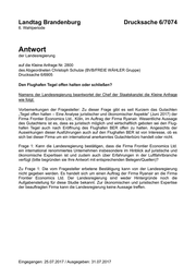 "content": "Landtag Brandenburg Drucksache 6/7074 6. Wahlperiode Antwort der Landesregierung auf die Kleine Anfrage Nr. 2800 des Abgeordneten Christoph Schulze (BVB/FREIE WÄHLER Gruppe) Drucksache 6/6905 Den Flughafen Tegel offen halten oder schließen? Namens der Landesregierung beantwortet der Chef der Staatskanzlei die Kleine Anfrage wie folgt: Vorbemerkungen der Fragesteller: Zu dieser Frage gibt es seit Kurzem das Gutachten „Tegel offen halten – Eine Analyse juristischer und ökonomischer Aspekte“ (Juni 2017) der Firma Frontier Economics Ltd., Köln, im Auftrag der Firma Ryanair. Wesentliche Aussage des Gutachtens ist es, dass es juristisch möglich und wirtschaftlich geboten sei den Flug- hafen Tegel auch nach Eröffnung des Flughafen BER offen zu halten. Angesichts der Auswirkungen dieser Ausführungen auch auf den Flughafen BER ist von Interesse, ob es sich bei dieser Firma um ein international anerkanntes Gutachterbüro handelt oder nicht. Frage 1: Kann die Landesregierung bestätigen, dass die Firma Frontier Economics Ltd. ein international renommiertes Unternehmen insbesondere im Hinblick auf juristische und ökonomische Expertisen ist und zudem auch über Erfahrungen in der Luftfahrtbranche verfügt (bitte begründen sie Ihre Antwort mit entsprechenden Belegen/Quellen)? Zu Frage 1: Die vom Fragesteller erbetene Bestätigung kann von der Landesregierung nicht gegeben werden. Es handelt sich um einen Auftrag der Firma Ryanair an die Firma Frontier Economics Ltd. Der Landesregierung sind weder Hintergründe noch die Aufgabenstellung für diese Studie bekannt. Zur ökonomischen und juristischen Expertise der beauftragten Firma kann die Landesregierung keine Aussage treffen. Eingegangen: 25.07.2017 / Ausgegeben: 31.07.2017",