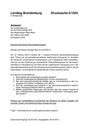 "content": "Landtag Brandenburg Drucksache 6/1054 6. Wahlperiode Antwort der Landesregierung auf die Kleine Anfrage 350 des Abgeordneten René Wilke der Fraktion DIE LINKE Drucksache 6/752 Deutsch-Polnischer Gesundheitsverband Wortlaut der Kleinen Anfrage 350 vom 03.03.2015: Am 12. Februar fand in Slubice die 1. Deutsch-Polnische Gesundheitsfachtagung statt. Thema war die grenzüberschreitende medizinische Versorgung. In Vorträgen der deutschen und polnischen Krankenkassen und in Gesprächen über Fachkräftesi- cherung und die Schaffung der erforderlichen Rahmenbedingungen für die Zusam- menarbeit von Brandenburg und Polen bei der medizinischen Versorgung und in der Gesundheitswirtschaft wurde die Gründung eines Interessenverband erörtert, der die Gesundheits- und Sozialbranche beiderseits der Grenze vertreten könnte. Ich frage die Landesregierung: 1. Wie bewertet die Landesregierung diese Initiative? 2. Sieht die Landesregierung Möglichkeiten für eine Unterstützung? 3. Wie viele grenzüberschreitende Notfälle gab es in Brandenburg in den ver- gangenen fünf Jahren? (Auflistung nach Jahren) 4. Sind der Landesregierung Probleme in der grenzüberschreitenden medizini- schen Versorgung bekannt? Wenn ja, welche? 5. Welche gesetzlichen Regelungen des Bundes oder des Landes müssten für eine unkompliziertere grenzüberschreitende medizinische Versorgung geän- dert werden? Namens der Landesregierung beantwortet die Ministerin für Arbeit, Soziales, Ge- sundheit, Frauen und Familie die Kleine Anfrage wie folgt: Frage 1: Wie bewertet die Landesregierung diese Initiative? Datum des Eingangs: 02.04.2015 / Ausgegeben: 08.04.2015",