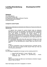 "content": "Landtag Brandenburg Drucksache 6/4791 6. Wahlperiode Antwort der Landesregierung auf die Kleine Anfrage 1868 der Abgeordneten Axel Vogel und Benjamin Raschke Fraktion Bündnis 90/DIE GRÜNEN Drucksache 6/4454 Lottogeld für soziale Projekte Namens der Landesregierung beantwortet der Minister der Finanzen die Kleine An- frage wie folgt: „37 Millionen Euro Lottogeld für soziale Projekte“ titelte die Märkische Allgemeine am 30. Mai und vermeldete: „Mit diesen Einnahmen unterstützte das Land den Breiten- und Spitzensport, den Denkmal- und Umweltschutz sowie viele Aktionen im kulturellen und sozialen Bereich.“ In der Pressemitteilung der Staatskanzlei heißt es dazu: „Allein im vergangenen Jahr standen fast 37 Millionen Euro aus so genannten Lottomitteln zur Verfügung. Damit hätten die Ministerien der Landesregierung viele Projekte gefördert und das Ehrenamt gestärkt“. Der Haushaltsplan des Landes lässt dafür aber keinen Spielraum. Dort sind für entsprechende Förderungen durch die Ministerien nur 4,895 Mio. EUR vorgesehen. Für die Sportförderung an anderer Stelle noch einmal 16 Mio. EUR. Frage 1: In welchen Ausgabetiteln wurden die eingenommenen „Lottomittel“ (Einnah- men des Titels 123 20 im Kapitel 20 020) verbucht? Bitte nach Titeln und Summen genau aufschlüsseln. zu Frage 1: Die einschlägigen Ausgabetitel sind, bezogen auf den Landeshaushalt 2015: Kapitel 20 020 Titel 684 59 – Ansatz: 4.895.000,-- EUR; Kapitel 05 810 Titelgruppe 60 (Sportförderung) – Ansatz: 16.000.000,-- EUR Frage 2: Gibt es für die Vergabe der Mittel durch die Ministerien einheitliche Vergabe- kriterien? Wenn ja, welche? Datum des Eingangs: 26.07.2016 / Ausgegeben: 01.08.2016",