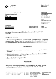"content": "Landratsamt Landkreis Ess!| ingen Landratsamt Esslingen - Esslingen 73726 Esslingen und Veterinär- N. a. Lebensmittelüberwachungsa Postzustellungsurkunde Am Aussichtsturm Herr 73207 Fink Lukas 5 Plochingen Telefon: 0711 Telefax: 0711 3902-41500 3902-58240 Internet: www.landkreis-esslingen.de Zentrale E-Mail-Adresse: LRA@LRA-ES.de Zeichen Unsere Bitte bei Antwort Telefon angeben Datum 3902-41500 0711 Veterinasgramt@l!ra-es.de auf Antrag Informationen 03.07.2019 gemäß Verbraucherinformationsgesetz vom 31.05.2019 Sehr Herr geehrter Fink, im Betrieb „Günes Kebaphaus, Kirchheimer auf Ihren 0.a. Antrag auf Auskunft, wann haben Kontrollen beiden letzten die Weilheim/Teck“ stattgefunden 73235 Straße 34, wurden Lebensmittelrecht das ergeht folgender und ob Verstöße festgestellt gegen LBescheid: 1. Antrag gegeben. erfolgt unverzüglich Informationszugang den beteiligten Dritten. an Bescheides 2. Der 3. Dieser Bescheid wird gemäß Verbraucherinformationsgesetz auf Informationen Dem nach schriftlich, statt- des Bestandskraft ergeht gebührenfrei. l.Gründe: bei unserer Behörde, (VIG), die Auskunft Sie haben am hier eingegangen 31.05.2019, Mit Schreiben, unter Berufung auf das Verbraucherinformationsgesetz Allgemeine Sprechzeiten: Montag Montag - - Freitag 8:00 Mittwoch 13:30 Donnerstag 13:30 Kreissparkasse zusätzlich - - - 12:00 Uhr 15:00 Uhr 18:00 Uhr Kfz-Zulassung Mittwoch Montag - Donnerstag Freitag 7:30 7:30 7:30 - - - 15:00 Uhr 18:00 Uhr 12:00 Uhr Esslingen-Nürtingen 900 021 BLZ: 611 500 20 Girokonto: IBAN: DE26 6115 0020 0000 9000 21 ESSLDE66XXX BIC/SWIFT: 12ZZZ00000093649 Gläubiger-ID:DE Steuer-Nr.: UST.-ID: 59316/00230 DE 145 340 165 S-Bahn Haltestelle Bus S 1 Plochingen 141 Haltestelle Stumpenhof Bahnhof",