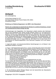 "content": "Landtag Brandenburg Drucksache 6/10935 6. Wahlperiode Antwort der Landesregierung auf die Kleine Anfrage Nr. 4312 des Abgeordneten Carsten Preuß (Fraktion DIE LINKE) Drucksache 6/10623 Einleitung von Niederschlagswasser vom BER in den Glasowbach Namens der Landesregierung beantwortet der Minister für Ländliche Entwicklung, Umwelt und Landwirtschaft die Kleine Anfrage wie folgt: Vorbemerkungen des Fragestellers: Der Glasowbach verläuft zwischen dem Selchower See und dem Rangsdorfer See, dessen einziger größerer Zufluss er ist. Vier Naturschutz- gebiete erstrecken sich entlang des Glasowbachs: der Selchower See, die Glasowbach- niederung, der ehemalige Blankenfelder See, der Rangsdorfer See. Besonders geschützt ist die Glasowbachniederung als Niedermoorgebiet mit großen Bruchwaldbereichen und als Lebensraum des Fischotters. Im Planfeststellungsbeschluss \"Ausbau Verkehrsflugha- fen Berlin-Schönefeld\" vom 13. August 2004, Az.: 44/1-6441/1/101 ist unter Punkt 12.3.3 die Einleitung von Niederschlagswasser in den Selchower Flutgraben und in den Glasow- bach erlaubt. 1. Liegen alle wasser- und naturschutzrechtlichen Genehmigungen vor, um Wasser in den Glasowbach einleiten zu können? zu Frage 1: Mit Planfeststellungsbeschluss „Ausbau Verkehrsflughafen Berlin-Schönefeld“ vom 13.08.2004 (PFB) wurde die wasserrechtliche Erlaubnis für die Einleitung von maxi- mal 1m³/s gereinigtem Niederschlagswasser in den Glasowbach unter Beachtung be- stimmter Überwachungswerte und Auflagen erteilt. Die Erlaubnis gilt bis zum Jahr 2025. Zudem wurden die folgenden Gewässerausbaumaßnahmen im Glasowbach nach Maßga- be des Plans E 6-39 und E 6-39 A1, unter Einhaltung bestimmter Auflagen, zugelassen: • Erhöhung der Böschungsoberkante, • Steinschüttungen als Kolkschutz, • Errichtung von Durchlässen, • Errichtung eines Sohlbauwerks mit Fußgängerbrücke aus Holz. Für den Ausbau des Glasowbachs wurde die Befreiung von den Verboten über das Natur- schutzgebiet „Torfbusch“ und „Ehemaliger Blankenfelder See“ für die in A II 9.2.2.2 und A II 9.2.2.4 des PFB genannten Maßnahmen erteilt. Ferner wurde die Befreiung von den Ver- boten der Veränderungssperre hinsichtlich des (zum Zeitpunkt des Erlasses des Planfest- stellungsbeschlusses) im Verfahren befindlichen Naturschutzgebiets „Glasowbachniede- rung“ für die in A II 9.2.2.3 und A II 9.2.2.8 des PFB aufgezählten Maßnahmen erteilt. 2. Für die Einleitung welcher Mengen Wasser sind die Querschnitte des Glasowbachs bzw. der Brückendurchlässe geeignet? Eingegangen: 20.03.2019 / Ausgegeben: 25.03.2019",