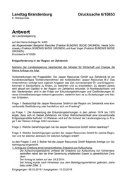 "content": "Landtag Brandenburg Drucksache 6/10853 6. Wahlperiode Antwort der Landesregierung auf die Kleine Anfrage Nr. 4265 der Abgeordneten Benjamin Raschke (Fraktion BÜNDNIS 90/DIE GRÜNEN), Heide Schi- nowsky (Fraktion BÜNDNIS 90/DIE GRÜNEN) und Axel Vogel (Fraktion BÜNDNIS 90/DIE GRÜNEN) Drucksache 6/10550 Erdgasförderung in der Region um Zehdenick Namens der Landesregierung beantwortet der Minister für Wirtschaft und Energie die Kleine Anfrage wie folgt: Vorbemerkungen der Fragesteller: Die Jasper Resources GmbH aus Zehdenick ist ein hundertprozentiges Tochterunternehmen der holländischen Jasper Resources B.V. Das Unternehmen verfolgt nach eigenen Angaben das Ziel, konventionelle Öl- und Erdgasvor- kommen in Deutschland zu finden, zu bewerten und zu erschließen. Zu diesem Zweck wird aktuell ein Gasfeld in der Region um Zehdenick erkundet. In Norddeutschland und den Niederlanden sind in der Folge von Erkundungsbohrungen und Gasförderungen di- verse Umweltbelastungen bekannt geworden; weiterhin kam es zu Erdsetzungen und klei- nen Erdbeben. Frage 1: Beabsichtigt die Jasper Resources GmbH in der Region um Zehdenick eine kon- ventionelle Gasförderung oder handelt es sich um Fracking? zu Frage 1: Die Auswertung der Erkundungsbohrungen in den Jahren 1974 bis 1978 ergab, dass sich im Gebiet Zehdenick mit hoher Wahrscheinlichkeit eine konventionelle Erdgaslagerstätte befindet. Im Weiteren wird auf die Antwort der Landesregierung zu Fra- ge 1 der Kleinen Anfrage 4242 verwiesen. Frage 2: Welche Genehmigungen hat die Jasper Resources GmbH bisher beantragt? Frage 3: Welche Genehmigungen wurden der Jasper Resources GmbH für welche Regio- nen und für welchen Zeitraum mit welchen Auflagen erteilt? zu den Fragen 2 und 3: Bisher hat die Jasper Resources GmbH folgende Anträge zur Ge- nehmigung eingereicht: 1. Antrag zur Erteilung einer bergrechtlichen Erlaubnis zur Aufsuchung: - Die Aufsuchungserlaubnis umfasst die Erlaubnis zur Aufsuchung von Kohlenwas- serstoffen nebst den bei ihrer Gewinnung anfallenden Gasen zu gewerblichen Zwe- cken. - Der Antrag ist datiert auf den 24.3.2014. - Der Antrag wurde nach Hinweisen aus dem Beteiligungsverfahren geändert, siehe dazu unter Ziffer 2. Eingegangen: 08.03.2019 / Ausgegeben: 13.03.2019",