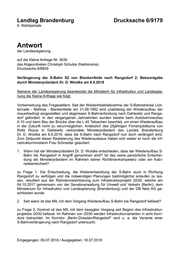 "outline": "- [1. Wann hat der Ministerpräsident Dr. D. Woidke entschieden, dass der Wiederaufbau S-Bahn bis Rangsdorf in Angriff genommen wird? Ist das seine persönliche Entscheidung als Ministerpräsident im Rahmen seiner Richtlinienkompetenz oder ein Kabinettsents...](#page-1)\n- [zu Frage 1: Die Entscheidung, die Weiterentwicklung der S-Bahn auch in Richtung Rangsdorf zu verfolgen und die notwendigen Planungen baldmöglichst anlaufen zu lassen, resultiert aus der Rahmenvereinbarung zum Infrastrukturprojekt i2030, welche am 04.1...](#page-1)\n- [2. Seit wann ist das MIL mit dem Vorgang Wiederaufbau S-Bahn bis Rangsdorf befasst?](#page-1)\n- [zu Frage 2: Konkret ist das MIL mit dem besagten Vorgang seit Beginn des Infrastrukturprojektes i2030 befasst. Im Rahmen von i2030 werden Infrastrukturvarianten in acht Korridore betrachtet. Im Korridor „Berlin-Dresden/Rangsdorf“ wird u. a. die Varian...](#page-1)\n- [3. Welche konkreten Hürden im planerischen und im baulichen Sinne müssen zur Realisierung genommen werden?](#page-2)\n- [zu Frage 3: Die weiteren Planungsschritte sind mit dem laufenden Ausbau der Dresdner Bahn zu koordinieren. Von Relevanz sind dabei die Freihaltung der für die S-Bahn-verlängerung benötigten Trassen und die Sicherung von Grundstücken für die Bahnhofsen...](#page-2)\n- [4. Welche Planungsschritte müssen nunmehr konkret gegangen werden?](#page-2)\n- [zu Frage 4: Für die potenzielle S-Bahnverlängerung nach Rangsdorf werden aktuell seitens der Deutschen Bahn AG fahrplantechnische Untersuchungen vorgenommen. Es folgen eine eisenbahnwissenschaftliche Untersuchung sowie die Erstellung einer verkehrlich...](#page-2)\n- [5. Gibt es einen Zeitplan, eine Zeitleiste für das Projekt?](#page-2)\n- [zu Frage 5: Die unter 4. genannten Prüf- und Planungsprozesse werden voraussichtlich im Jahr 2020 abgeschlossen sein.](#page-2)\n- [6. Welche administrativen Schritte wurden schon veranlasst?](#page-2)\n- [zu Frage 6: Zur Begleitung der Planungs- und Prüfprozesse wurden Arbeitsgruppen auf unterschiedlichen Entscheidungsebenen eingerichtet.](#page-2)\n- [7. Wie ist die Deutsche Bahn AG in das Projekt Wiederaufbau S-Bahn bis Rangsdorf einbezogen, ggf. wer und seit wann?](#page-2)\n- [zu Frage 7: Die DB Netz AG, Regionalbereich Ost, ist Partner im Infrastrukturprojekt i2030 und federführend für die Planungsprozesse mit den Ländern zuständig.](#page-2)\n- [8. Ist der VBB in das Projekt Wiederaufbau S-Bahn bis Rangsdorf einbezogen, ggf. wie, wer und seit wann?](#page-2)\n- [zu Frage 8: Ja, der VBB ist seit Beginn des Infrastrukturprojektes i2030 einbezogen. Er koordiniert die umfangreichen Planungs- und Prüfprozesse und organisiert den Lenkungskreis der drei Projektpartner.](#page-2)\n- [9. Sind die betroffenen Kommunen und der Landkreis Teltow-Fläming in das Projekt Wiederaufbau S-Bahn bis Rangsdorf einbezogen, ggf. wie, wer und seit wann?](#page-2)\n- [zu Frage 9: Auf den Regionaldialogen des MIL zum LNVP in 2017 und im VBB im Dialog 2018 sind die jeweiligen Planungssachstände darlegt worden. Im Rahmen der weiteren Planungen im Infrastrukturprojekt i2030 haben sich die Projektpartner darauf verständ...](#page-2)\n- [10. Welche Kosten wird das Projekt Wiederaufbau S-Bahn bis Rangsdorf verursachen? Wer trägt die Kosten?](#page-2)\n- [11. Sollen die Kommunen Blankenfelde, Rangsdorf und / oder der Landkreis Teltow-Fläming an den Kosten beteiligt werden?](#page-3)\n- [zu Fragen 10 und 11: Aktuell werden in den jeweiligen Teilprojekten noch die entsprechenden verkehrlichen Grundlagen ermittelt. Aussagen zu Kosten einer möglichen Projektrealisierung können noch nicht getroffen werden.](#page-3)\n- [12. Bedarf es Änderungen in der „Mobilitätsstrategie 2030“ des Landes Brandenburg?](#page-3)\n- [zu Frage 12: Nein, durch die Planungen wird keine Änderung der Mobilitätsstrategie 2030 des Landes Brandenburg notwendig.](#page-3)\n- [13. Bedarf es Änderungen im Landesentwicklungsplan LEP HR?](#page-3)\n- [zu Frage 13: Nein, durch die Planungen wird keine Änderung des LEP HR notwendig.](#page-3)\n- [14. Wir wird das Projekt Wiederaufbau S-Bahn bis Rangsdorf im Nahverkehrsplan des Landes Brandenburg abgebildet?](#page-3)\n- [zu Frage 14: Die Untersuchung des Korridors Berlin-Dresden/Rangsdorf mit der Anbindung von Rangsdorf wird im LNVP im Rahmen des Infrastrukturprojektes i2030 abgebildet.](#page-3)\n",