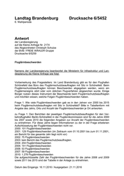 "content": "Landtag Brandenburg Drucksache 6/5452 6. Wahlperiode Antwort der Landesregierung auf die Kleine Anfrage Nr. 2174 des Abgeordneten Christoph Schulze der BVB / FREIE WÄHLER Gruppe Drucksache 6/5259 Fluglärmbeschwerden Namens der Landesregierung beantwortet die Ministerin für Infrastruktur und Lan- desplanung die Kleine Anfrage wie folgt: Vorbemerkung des Fragestellers: Im Land Brandenburg gibt es für den Flughafen Schönefeld das Büro des Fluglärmschutzbeauftragten mit Sitz in Schönefeld. Beim Fluglärmschutzbeauftragten können Beschwerden abgegeben werden, wenn ein Fluglärmereignis stört oder vom üblichen Flugverfahren abgewichen wurde. Einige Bürger nutzen dieses Instrument der Beschwerde beim Fluglärmschutzbeauftragten und möchten wissen, welche Folgen Fluglärmbeschwerden haben. Frage 1: Wie viele Fluglärmbeschwerden gab es in den Jahren von 2000 bis 2015 beim Fluglärmschutzbeauftragten mit Sitz in Schönefeld? Bitte in Tabellenform mit Angabe des Jahrs, Orts und Anzahl der Fluglärmbeschwerden je Ort antworten. zu Frage 1: Den Berichten der jeweiligen Fluglärmschutzbeauftragten für den Ver- kehrsflughafen Berlin-Schönefeld in der Fluglärmkommission sind für die Jahre 2000 bis 2007 sowie 2010 die folgenden Angaben zur Anzahl der Fluglärmbeschwerden zu entnehmen. Für diese Jahre liegen Informationen zu der in der Frage erbetenen Aufschlüsselung der Fluglärmbeschwerden nicht vor. 2000: 101 Fluglärmbeschwerden 2001: 129 Fluglärmbeschwerden (im Zeitraum vom 01.10.2001 bis zum 01.11.2001, ein Bericht für das gesamte Jahr liegt nicht vor) 2002: 75 Fluglärmbeschwerden 2003: kein Bericht des Fluglärmschutzbeauftragten. 2004: 204 Fluglärmbeschwerden 2005: 141 Fluglärmbeschwerden 2006: 53 Fluglärmbeschwerden 2007: 59 Fluglärmbeschwerden 2010: 1.278 Fluglärmbeschwerden Die aufgeschlüsselte Zahl der Fluglärmbeschwerden für die Jahre 2008 und 2009 sowie 2011 bis 2015 sind der Tabelle in der Anlage zu entnehmen. Datum des Eingangs: 16.11.2016 / Ausgegeben: 21.11.2016",