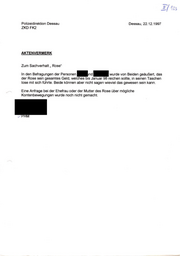 "content": "AfA:\n\nPolizeidirektion Dessau Dessau, 22.12.1997\nZKD FK2\n\nAKTENVERMERK\n\nZum Sachverhalt „ Rose“\n\nIn den Befragungen der Personen u wurde von Beiden geäußert, das\nder Rose sein gesamtes Geld, welches bis Januar 98 reichen sollte, in seinen Taschen\nlose mit sich führte. Beide können aber nicht sagen wieviel das gewesen sein kann.\n\nEine Anfrage bei der Ehefrau oder der Mutter des Rose über mögliche\nKontenbewegungen wurde noch nicht gemacht.",