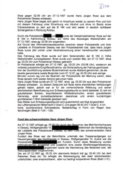 "content": "a {06\n\n-2-\n\nEtwa gegen 02.58 Uhr am 07.12.1997 wurde Hans Jürgen Rose aus dem\nPolizeirevier Dessau entlassen.\n\nHans Jürgen Rose begab sich gleich im Anschluss wieder zu seinem Pkw und fuhr\nmit diesem Fahrzeug unter Einwirkung von Alkohol und ohne im Besitz eines\nFührerscheines zu sein auf die B 184 und dort weiter in deutlich sichtbarer\nSchlängellinie in Richtung Roßlau.\n\nDurch die Polizeistreiie U. Ge der Verkehrsteilnehmer Rose auf der\nB 184 in Fahrtrichtung Roßlau, auf Höhe des Abzweiges Wallwitzhafen am\n07.12.1997, etwa gg. 03.08 Uhr angehalten.\n\nAuf Grund des Informationsaustausches zwischen dieser Polizeistreife und ihrer\nLeitstelle im Polizeirevier Dessau war den Polizeibeamten klar, dass Hans Jürgen\nRose kurze Zeit vorher unter Alkoholeinwirkung einen Verkehrsunfall verursacht\nhatte.\n\nDas Fahrzeug des Rose wurde auf dem Seitenstreifen der B 184 in Höhe\nWallwitzhafen zurückgelassen. Rose wurde zum zweiten Mal, am 07.12.1997, etwa\n99. 03.20 Uhr zum Polizeirevier Dessau gebracht.\n\nIm Polizeirevier erfolgte am 07.12.1997, gg. 03.20 Uhr (03.08 Uhr), wiederum als\nmildeste polizeiliche Eingriffsmaßnahme, die Sicherstellung der Fahrzeugschlüssel.\nVon der Durchführung weiterer Blutentnahmen wurde Abstand genommen, da die\nbereits genommene zweite Blutprobe (vom 07.12.97, gg. 02.55 Uhr) erst wenige\nMinuten zurück lag und die Beamten der Polizeistreife der Meinung waren, dass\nRose danach nicht wieder Alkohol getrunken hatte.\n\nHans Jürgen Rose wurde am 07.12.1997, etwa gg. 03.35 Uhr aus dem Polizeirevier\nDessau entlassen. Zu diesem Zeitpunkt soll Rose keine ersichtlichen Verletzungen\ngehabt haben, jedoch war er für die vorherrschende Witterung und seiner\nalkoholischen Beeinflussung zum Entlassungszeitpunkt zu leicht bekleidet. Er soll mit\ngraufarbenen Socken, braunfarbenen Wildiederschuhen, einem graufarbenen\nHerrenslip, einer dunkelblaufarbenen Jeanshose und einem kurzärmligen\ngrünfarbenen T-Shirt bekleidet gewesen sein.\n\nDas Wetter zum Entlassungszeitpunkt wird gutachterlich wie folgt eingeschätzt:\n\ndie Lufttemperaturen Mitternacht O0 Grad C und gegen 06.00 Uhr 1 Grad C, 4 cm\nhohe, durchbrochene Schneedecke, Niederschlag in Form von Regen bzw.\nSprühregen (Blatt II / 124 — 126).\n\nFund des schwerverletzten Hans Jürgen Rose:\n\nAm 07.12.1997 erfolgte gg. 05. ner des Mehrfamilienhauses\nin Dessau, Wolfgangstraße 15, telefonisch die Verständigung\nder Leitstelle des Polizeireviers U, ZU und des schwerverletzten Hans\n\nJürgen Rose.\n\nFundort des Rose war die Betonfläche unterhalb des Treppenaufganges zur\nHauseingangstür des Hochhauses in Dessau, Wolfgangstraße 15. Zuerst war die\nPolizeistreife am Fundort. Durch diese Besatzung wurden\nHilfsmaßnahmen eingeleitet und zusätzlich eine zweite Streifenwagenbesatzung,\nangefordert sowie die Alarmierung des Notarztes bzw. der\nRettungssanitäter vorgenommen.\n\nDer am 07.12.1997 gg. 05.33 Uhr alarmierte Notarzt traf gg. 05.40 Uhr bei dem\nPatienten Rose ein. Es erfolgte die Notversorgung des stark alkoholisierten,\nunterkühlten, zwar ansprechbaren, aber nur bedingt kooperativen Rose (Blatt I / 51).",
