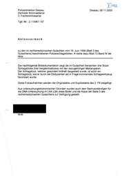 "content": "Ya\n\nPolizeidirektion Dessau Dessau, 08.11.2000\nZentraler Kriminaldienst\n2. Fachkommissariat\n\nTob.-Nr.: 2 / 15967 / 97\n\nAktenvermerk\n\nzu den im rechtsmedizinischen Gutachten vom 18. Juni 1998 (Blatt 3 des\nGutachtens) beschriebenen Polizeischlagstöcken > siehe dazu Blatt 72 Band IV der\nAkte\n\nDie nachfolgende Bilddokumentation zeigt die im Gutachten benannten drei Stück\nSchlagstöcke (hier Vergleichsstücke) mit den dazugehörigen Maßangaben.\n\nDer Schlagstock, welcher gesondert bildhaft dargestellt wurde, ist solch ein\nSchlagstock, wie er durch die Obduzenten als in Frage kommendes Schlagwerkzeug\nfavorisiert wurde.\n\nDiese Fotoaufnahmen werden der Originalakte und Duplikatakte des 2. FK beigefügt.\nAus untersuchungsökonomischen Gründen wurden auch dem Sachverständigen für\n\ndie DNA-Untersuchung im LKA LSA diese Bilder und die Kopie der Seite 3 des\nrechtsmedizinischen Gutachtens zur Verfügung gestellt.\n\nKHK",