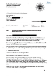"content": "Polizeidirektion Dessau\nZentraler Kriminaldienst\n2. Fachkommissariat\n\n \n\n— PD Dessau, ZKD, 2 FK, Kühnauer Str. 161, 06846 Dessau __\n\nLKALSA, Abt.: 6\n\nDez.: 61\n\nzu Händen Ev iA\nLübecker Str. 53 - 63\n\n39124 Magdeburg\n\nAnsprechpartner\nKHK\nIhr Zeichen, Ihre Nachricht vom Mein Zeichen B/Fax Datum\n421 (0340) 6000-311/320 08.11.00\n\nBetr.: Untersuchungsauftrag DNA-Untersuchung mit vorheriger\nFaseruntersuchung\n\nSon ver\n\nhierdurch werden Sie beauftragt, nach Antrag der Staatsanwaltschaft Dessau und\ndem Beschluss des Amtsgerichtes Dessau, in der Todesermittiungssache zum\nNachteil des Hans Jürgen Rose DNA-Untersuchungen durchzuführen\n\nEine Ausfertigung des Beschlusses Amtsgericht Dessau vom 20.10.2000, Geschäfts-\nnummer Gs 486/00 füge ich als Anlage bei.\n\nDie gewünschten Untersuchungen sind in Komplexen zusammengefasst. Sie sollten\nin Abstimmung mit den Sachverständigen für Faserspurenuntersuchungen erfolgen.\n\n1. Untersuchungskomplex.\nArmbanduhr Casio des Geschädigten Rose\nDie Armbanduhr ist als Asservat 10 beschriftet.\n\nDer Geschädigte Rose hatte diese Armbanduhr am 07.12.1997 an einem\nHandgelenk getragen. Es besteht die Möglichkeit, dass sich an dieser Uhr Faser-\nund / oder DNA-Spuren von Personen befinden, welche mit dem Rose zur relevanten\nZeit Kontakt hatten, jedoch bisher diesen Fakt verschwiegen haben. Das könnten\nzum einen Polizeibeamte zum anderen Bewohner des Mehrfamilienhauses (Fundort)\nsein.\n\nDiese Uhr wurde am 09.12.1997 durch einen Sachbearbeiter des RKD Dessau\nvorschnell an die Ehefrau zurückgegeben.\n\n.2-",