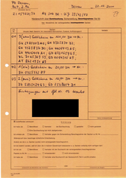 "content": "PD Desiun,\nud 2- ; Dessau, ei 22.A2. 2000\n\na ee re oö3 3 BE\n\nZIASIEF IF Ar SRD: uf 39 5#2 [97 {7\n\nNiederschrift über Berehsuehung, Sicherstellung, Beschlagnehme (Teil B)\nhier: Verzeichnis der sichergesteliten /sesehlagneimten Sachen\n\nLfd. Sachen Verbleib\nNr. (Anzahl, Maß, Gewicht, Art, besondere Kennzeichen, Zustand, Auffindungsort) “\n\noA (ma) Geldiheie zu 400,00 DU Nr. :\nGk 2335003 A6; @N +3+5334 22,\nGN 3375834 D0 ;GK HHOCH13 AS;\nGk Yuosyak AA : @D 632465965,\nDL M4S36I SI, GD vo643As Kg;\nAY 26249 43\n\n02 A (ein) Geldshun u 20.00 DH Nr. :\nQu 0325332 29\n\n03|2 (2wei) Geldshens u A409 Dh —Ar.:\nIt SI MZ4Y4G3: Gd 2538604 IA\nDu hagun gen kurt fr Wr. 0% beaulet\n\n& Zutrefiendes ankreuzen\n\n \n \n \n\n \n \n \n \n\n \n\n \n \n \n\n \n\nName ATsiegeeinnung:\n\nErkl ärung\n\nIch habe als Ü Betroffener Ü Vertreter die Durchsuchung Ü gestattet Ü nicht gestattet\nU] Eine Durchsuchung hat nicht stattgefunden\n\nich erhebe als U] Betroffener Ü) Vertreter gegen die Sicherstellung/Beschlagnahme der Sachen zu Ifd. Nr.___\n\nWiderspruch bzw. beantrage richterliche Entscheidung.\n\nAndere als die o. a. Sachen wurden nicht sichergestellt /beschlagnahmit\n\nIch bin belehrt worden, daß ich über die in meinem Gewahrsam belassenen o. a. Sachen vorläufig nicht verfügen dart.\n\nIch bin als U] Betroffener Ü Vertreter mit der Durchsicht der sichergestellten/beschlagnahmten\nPapiere zulid.N.________ D einverstanden U nicht einverstanden\nIch habe als Ü Betroffener Ü Vertreter eine Durchschrift der Niederschrift (Teil A und B) erhalten\n\n \n\n \n\n \n \n\n(Unterschrilt oes Betroffenen oder Vertreters (Unterschrit oes Zeugen\n\nPol. LSA 08.060\n07",