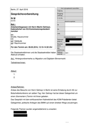 "content": "Vom Leitungsbereich auszufüllen\nBerlin, 27. April 2016\n TGB-Nr.\n\nGesprächsvorbereitung Eingang\n Leitung\n\nSt M V-/U-Nr.\na.d.D. Abzeichnungsleiste\n\nBetr.: St\nArbeitsmittagessen mit Herrn Martin Selmayr,\nKabinettchef von EU-Kommissionspräsident AL\nJuncker\n UAL\nOrt:\nStraße, Hausnummer Referatsinformationen\nOrt Referats-\nggf. Gebäude leiter/in\nggf. Raumnummer Bearbei-\n ter/in\nFür den Termin am: 09.05.2016, 13:15-14:30 Uhr\n Mit-\n zeichnung\nDie Staatssekretärinnen und die Staatssekretäre haben Referat EA1 -\nAbdruck erhalten. und AZ\n\n\nAnl.: Hintergrundvermerke zu Migration und Digitalem Binnenmarkt\n\nTeilnehmer/innen:\n\n\n\nAblauf:\n 1.\n 2.\n\n\n\n\nAnlass/Rahmen:\nAnlass des Besuchs von Herrn Selmayr in Berlin ist seine Einladung durch AA zur\nBotschafterkonferenz am selben Tag. Herr Selmayr hat bei dieser Gelegenheit um\neinen (Kennenlern-)Termin mit Ihnen gebeten.\nDas Gespräch mit dem einflussreichen Kabinettchef des KOM-Präsidenten bietet\nGelegenheit, politische Anliegen des BMWi auf einem direkten Wege anzubringen.\n\n\nFolgende Themen wurden angemeldet/sind zu erwarten:\n\n\n\n\n ...",