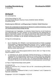 "content": "Landtag Brandenburg Drucksache 6/8381 6. Wahlperiode Antwort der Landesregierung auf die Kleine Anfrage Nr. 3332 des Abgeordneten Benjamin Raschke (Fraktion BÜNDNIS 90/DIE GRÜNEN) Drucksache 6/8169 Erweiterung einer Milchvieh- und Biogasanlage in Kolkwitz- Ortsteil Krieschow Namens der Landesregierung beantwortet der Minister für Ländliche Entwicklung, Umwelt und Landwirtschaft die Kleine Anfrage wie folgt: Vorbemerkungen des Fragestellers: Im Kolkwitzer Ortsteil Krieschow ist die Erweiterung einer Milchviehanlage auf 2.000 Tierplätze und die Erweiterung einer Biogasanlage am Standort Flachsweide 5 geplant. Hier sitzen die Unternehmen Agrar GmbH Cottbus-West, Milchproduktion Krieschow KG und Landhöfe Kolkwitz GmbH. Die bestehenden Anlagen befinden sich ca. 200 Meter von der nächsten Wohnbebauung entfernt. Ich frage die Landesregierung: 1. Der im September 2017 öffentlich in der Gemeindeverwaltung Kolkwitz ausgelegte Bebauungsplan \"Erweiterung Biogasanlage Krieschow\" muss u. a. aufgrund der Stel- lungnahmen Träger öffentlicher Belange überarbeitet und neu öffentlich ausgelegt werden: Welche Kritikpunkte waren hierfür jeweils ausschlaggebend und von welcher Behörde wurden diese benannt? zu Frage 1: Hinweise zum Bebauungsplanverfahren können allein vom Träger der Bau- leitplanung gegeben werden. 2. In Vorbereitung der derzeit beantragten BImSch-Genehmigung zur Erhöhung der Tierplatzzahlen der Milchproduktion Krieschow KG wurden bereits alte Stallanlagen abgerissen und neue Ställe errichtet. Wann wurden die notwendigen Bauanträge ge- stellt und genehmigt und wie wurden natur- und artenschutzrechtliche Belange, ins- besondere in Bezug auf eine lokal bedeutsame Schwalbenpopulation berücksichtigt? zu Frage 2: Folgende Bauanträge wurden gestellt: AZ 02465-2011-45 Kolkwitz OT Krieschow, Flur 2, Flurstück 1202 und 159 - Umstrukturierung Milchviehanla- ge Krieschow 1. Umbau Rinderstall 3 und 4 2. Neubau Rinderstall 5, Güllekanal für Stall 3, 4 und 5, Futtertisch 1 und 2, Futtertisch für Reprostall, Güllebehälter Eingegangen: 14.03.2018 / Ausgegeben: 19.03.2018",
