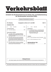 "content": "Amtsblatt des Bundesministeriums für Verkehr, Bau und Stadtentwicklung\n der Bundesrepublik Deutschland (VkBl.)\n\n I N H A LT S V E R\n i ZEICHNIS\n\n\n 62. Jahrgang Ausgegeben zu Bonn am 15. Juli 2008 Heft 13\n\n Amtlicher Teil\n Nr. Datum VkBl. 2008 Seite Nr. Datum VkBl. 2008 Seite\n\n Personalnachrichten Berichtigungen\n 94 19. 06. 2008 Bestellung . . . . . . . . . . . . . . . . . . . . . . 370 98 15. 07. 2008 Berichtigung zu Verkehrsblatt 2008,\n S. 322 Richtlinien zur Durchführung der Gefahrgut-\n verordnung Straße und Eisenbahn (GGVSE) (GGVSE-\n Wasserstraßen, Schifffahrt Durchführungsrichtlinien) – RSE –\n 1. Ergänzung und Berichtigung . . . . . . . . . . . . . . . . . 374\n 95 17. 06. 2008 Verzeichnis „Technisches Regelwerk –\n Wasserstraßen“ (TR-W), Ausgabe 2008-03, einschließ-\n lich „Wasserstraßenspezifische Liste Technischer Bau-\n bestimmungen“ (WLTB) . . . . . . . . . . . . . . . . . . . . . . . 370 Aufgebote\n 96 10. 06. 2008 Vereinbarung zwischen der Bundesre- 98a 15. 07. 2008 Aufbietungen verlorener Fahrzeugbriefe. . 374\n publik Deutschland und der Freien Hansestadt Bre-\n men, der Freien und Hansestadt Hamburg, den Län- (1-16)\n dern Mecklenburg-Vorpommern, Niedersachsen und 98b 15. 07. 2008 Aufbietungen gem. § 13 Abs. 4\n Schleswig-Holstein über die Verletztenversorgung auf\n See . . . . . . . . . . . . . . . . . . . . . . . . . . . . . . . . . . . . . . . 371\n 97 27. 06. 2008 Dreißigste Verordnung zur vorüberge-\n henden Abweichung von der Rheinschifffahrtspoli- Nichtamtlicher Teil\n zeiverordnung (30. RheinSchPVAbweichV) . . . . . . . . 373 Berichte und Mitteilungen . . . . . . . . . . . . . . . . . . . . . . . . . . 375\n\n\n\n\n Beilagenhinweis:\n Der heutigen Ausgabe unserer Zeitschrift liegt die Bestellpostkarte für den Sammelordner Verkehrsblatt bei.\n\n\n\n\n Das aktuelle Inhaltsverzeichnis und weitere Informationen finden Sie im Internet: http://www.verkehrsblatt.de",