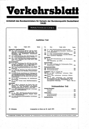 "content": "Verkehrsblali\nAmtsblatt des Bundesministers für Verkehr der Bundesrepublik Deutschland\n (VkBI)\n\n INHALTSVERZEICHNIS\n\n\n\n\n Amtlicher Teil\n\n\n\n Nr. Dat. VkBI 1973 Seite Nr. Dat. VkBI 1973 Seite\n\n Allgemeine Angelegenhelten 143 8. 4. 1973 Sonderlandeplatz Salzgitter-Bad . . 253\n 130 30. 3. 1973 Verordnung PR Nr. 1/73 zur Ände 144 8. 4. 1973 Freiballon-Startplatz Gersthofen\n rung der Verordnung PR Nr. 9/66 über Ver „VIA CLAUDIA\" 253\n gütungen im Spediteursammelgutverkehr mit 145 9. 4. 1973 Verkehrslandeplatz Langeoog . . . 253\n Eisenbahn uind Kraftwagen (Kundensatz-\n verordnung 1966) . 230 146 9. 4. 1973 Sonderlandeplatz Donzdorf-Messel\n berg, Landkreis Göppingen 254\n 131 27. 3. 1973 Belehrung über Reditsbehelfe nach\n der Verwaltungsgerichtsordnung (VwGO) . . 244 Straßenbau\n 132 30. 3. 1973 Fahrtschreiber-Anerkennungsricht 147 27. 3. 1973 Nebenbetriebe an den Bundesauto\n linie vom 7. Dezember 1972 (VkBI 1972 S. 863) bahnen;\n hier: 1. Änderung 244 hier: Rastplätze mit KWC 254\n Binnenschiffahrt\n 133 9. 4. 1973 Verordnumg Nr. 3/73 über die Fest Wasserstraßen\n setzung von Entgelten für Verkehrsleistungen 148 3. 4. 1973 Auflösung des Neubauamtes Eider-\n der Binnenschiffahrt vom 14. März 1973 abdämmung in Heide 254\n (FA Nr. 2/73 Frachtenausschuß für den Rhein) 245\n 134 28. 3. 1973 Ungültigkeitserklärung eines Schif Personalnachrichten\n ferpatents 251 149 Stellenausschreibung 254\n 135 2. 4. 1973 IX. Nachtrag zum Güterverzeichnis 150 Personalnächrichten . 255\n für den Verkehr auf deutschen Binnenwasser\n straßen 251 Aufgebote (nidit in Ausgabe B)\n 136 5. 4. 1973 Zweite Anordnung zur Änderung der 150a 30. 4. 1973 Aufbietung verlorener Fahr\n schiffahrtspolizeilichen Anordnung der Wasser- zeugbriefe\n und Schiffahrtsdirektion Würzburg über das 150b 30. 4. 1973 Aufbietung verlorener Führer\n Wasserskifahren auf dem Main und dem Main- scheine\n Donau-Kanal . 251\n 150c 30. 4. 1973 Aufbietung von verlorenen\n 137 27. 3. 1973 Verlustanzeige für Schiffahrtab Fahrzeugscheinen und Bescheinigungen über\n gabenbelege 251 die Zuteilung amtlicher Kennzeichen für zu\n 138 27. 3. 1973 Verlust eines Sdiiffahrtabgaben- lassungsfreie Fahrzeuge 264 a — 264 ooo\n beleges . . . . . . 251\n Seeverkehr\n 139 10. 4. 1973 2. Änderung des Tarifs über das\n Entgelt für Lotsungen zwischen den Seelots\n revieren an der deutschen Nordseeküste Nichtamtlidier Teil\n (Distanzlotstarif-DLT) vom 10. April 1973 . . 252\n 140 6. 4. 1973 Ungültigkeitserklärung verlorenge Zeitschriftenschau\n gangener Schiffsmeßbriefe 252 Übersicht 256\n Luftfahrt Auslese 258\n\n 141 4. 4. 1973 Hubschrauber-Sonderlandeplatz Bücherschau\n Kreiskrankenhaus „Dreieich\" Langen, Land Neuerscheinungen 263\n kreis Offenbach/Main . 253\n Buchbesprechung 263\n 142 6. 4.1973 Hubschrauberlandeplatz Nordenham-\n Einswarden . 253 Rechtsprechung 264\n\n\n\n\n 27. Jahrgang Ausgegeben zu Bonn am 30. April 1973 Heft 8\n\n\n\n\n Verlagspostamt Dortmund. Beim Ausbleiben des Verkehrsblattes wollen Postbezieher sich lediglich an die liefernden Postämter wenden.",