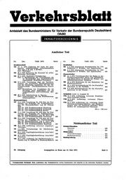 "content": "Verkehrsblall\nAmtsblatt des Bundesministers für Verkehr der Bundesrepublik Deutschland\n (VkBI)\n INHALTSVERZEICHNIS\n\n\n\n\n Amtlidier Teil\n\n\n\n Nr. Dat. VkBI 1972 Seite Nr. Dat. VkBI 1972 Seite\n\n Straßenverkehr Straßenbau\n 152 17. 4. 1972 Änderung der Liste der aner 165 4. 4.1972 Allgemeines Rundschreiben Nr. 7/72\n kannten selbstfahrenden Arbeitsmaschinen Sachgebiet 5: Brücken- und Ingenieurbau) . 239\n (DA zum § 18 Abs. 2 StVZO); 166 6. 4.1972 Allgemeines Rundschreiben Nr. 8/72\n hier: Meß wagen 226 Sachgebiet 5: Brücken- und Ingenieurbau . 245\n 153 20. 4.1972 Erfassung der Kranlast bei selbst\n fahrenden Kranwagen 226 Wasserstraßen\n 154 25.4.1972 Kraftfahrt-Versicheruing; 167 11. 4.1972 Verordnung über das Baden in den\n hier: 2. Berichtigung des Verzeichnisses der Bundeswasserstraßen Rhein und Schiffahrts\n im Bundesgebiet zum Geschäftsbetrieb weg Rhein-Kleve im Bereich der Wasser- und\n zugelassenen Kraftfahrt-Versicherer . 226 Schiffahrtsdirektion Duisburg 245\n 155 27.4.1972 Verordnung über die Tarifkom- 168 18. 4.1972 Richtlinien für den Rostschutz von\n mission, die erweiterten Tarifkommissionen Stahlwasserbauten 246\n und die beratenden Ausschüsse für den Gü 169 12.1.1972 Betriebsordnung für das Stuirmflut-\n terkraftverkehr (Tarifkommissionen-Verord sperrwerk in der Krückau 256\n nung);\n hier: Einreichung von Vorschlägen für die 170 9. 2.1972 Betriebsordnung für das Sturmflut\n Berufumg eines Nachfolgers für ein sperrwerk in der Pinnau 257\n ausgeschiedenes stellvertretendes Mit\n glied . 227\n Aufgebote (nicht in Ausgabe B)\n 156 28.4.1972 Gebietsreform in Bayern;\n hier: Auswirkungen auf das Kraftfahrzeug 170a 15. 5.1972 Aufbietung verlorener Kraftfahr\n zulassungswesen 227 zeug-(Anhänger-)briefe\n 170b 15.5.1972 Aufbietumg verlorener Führer-\n Binnenschiffahrt sdieine\n 157 12. 4.1972 Verordnung Nr. 3/72 über die Fest 170c 15. 5.1972 Aufbietung von verlorener Kraft\n setzung von Entgelten für Verkehrsleistun fahrzeug-(Anhänger-)scheinen und Bescheini\n gen der Binnenschiffahrt vom 29. Februar gungen über die Zuteilung amtlicher Kenn\n 1972 zeichen für zulassungsfreie Fahrzeuge\n (FD Nr. 2/72 Frachtenaussdiuß Hamburg)\n (FB Nr. 3/72 Frachtenausschuß Dortmund) 264 a - 264 eeee\n (FG Nr. 1/72 Frachtenaussschuß Berlin) . . . 228\n 158 17. 4.1972 Verordnung Nr. 6/72 über die Fest\n setzung von Entgelten für Verkehrsleistun\n gen der Binnenschiffahrt vom 24. März 1972\n (FB Nr. 5/72 Frachtenausschuß Dortmund) . 230\n 158 18. 4.1972 Verordnung Nr. 7/72 über die Fest\n setzung von Entgelten für Verkehrsleistun\n gen der Binnenschiffahrt vom 5. April 1972\n (FB Nr. 6/72 Frachtenauisschuß Dortmund)\n (FD Nr. 3/72 Frachtenaussdiuß Hamburg) . 237 Niditamtlidier Teil\n 160 29. 3.1972 Aufbietung verlorener Abgabener\n Zeitschriftenschau\n klärungen . . . . . 238\n 161 4.4.1972 Verlustanzeige für Schiffahrtab Übersicht 259\n gabenbelege 238 Auslese 261\n 162 20. 4.1972 Ungültigkeitserklärung eines Schif BUcherschau\n ferpatents 238 Neuerscheinungen 262\n 163 21. 4.1972 Ungültigkeitserklärung eines Schif Buchbesprechung 262\n ferpatents 238 Rechtsprechung 262\n 164 26.4.1972 Auflösumg des Schifferbetriebsver\n bandes „Jus et Justitia\" in Duisburg-Ruhrort 239\n\n\n\n\n 26. Jahrgang Ausgegeben zu Bonn am 15. Mai 1972 Heft 9\n\n\n\n\n Verlagspostamt Dortmund. Beim Ausbleiben des Verkehrsblattes wollen Postbezieher sich lediglich an die liefernden Postämter wenden",