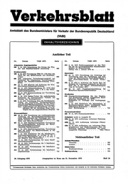 "content": "Verkehrsblall\nAmtsblatt des Bundesministers für Verkehr der Bundesrepublik Deutschland\n (VkBI)\n\n INHALTSVERZEICHNIS\n\n\n\n\n Amtlicher Teil\n\n\n Nr. Datum VkBI 1975 Seite Nr. Datum VkBI 1975 Seite\n\n Allgemeine Angelegenheiten 414 5. 12. 1975 Entfernungszeiger zu den Tari\n fen für die nordwestdeutschen Bundeswasser\n 398 8. 12. 1975 Neuordnunir der Grenze des Was\n ser- und Scihiffahrtsamtes Lauenburg . . . 698 straßen im Binnenbereich\n Gültig vom 1. Januar 1976 an 714\n Straßenverkehr\n Seeverkehr\n 399 9. 12.1975 Verordnung TSM Nr. 1/75 über den\n Tarif für den Möbelverkehr mit Kraftfahr 415 24. 11. 1975 Verordnung zur Änderung der\n zeugen 698 Verordnung über die Verwaltung und Ord\n 400 1975 Allgemeine Verwaltungsvorsdirift zur nung der Seelotsreviere Nord-Ostsee-Kanal I\n Änderung der Allgemeinen VerwaltungsVor und Nord-Ostsee-Kanal II / Kieler Förde /\n Trave 714\n schrift zur Straßenverkehrs-Ordnung (Vwv-\n StVO) 698 416 5. 12. 1975 3. Änderung des Tarifs über die\n 401 18. 11. 1975 Hinweis auf Änderung der Stra Entgelte für Lotsungen außerhalb der Reviere\n ßenverkehrs-Zulassungs-Ordnung 708 über See in der Ostsee (Überseelotsungen)\n vom 21. November 1975 715\n 402 25. 11. 1975 Bekanntmachung Nr. 17/75 über\n Sonderabmachungen nadi § 22 a des Güter 417 18. 11. 1975 Ungültigkeitserklärung für\n kraftverkehrsgesetzes 708 Motorboot-/Sportbootführerscheine . . . . 716\n 403 27. 11. 1975 Bekanntmachung zur Verordnung\n TSF Nr. 5/75 709 Straßenbau\n 404 9. 12. 1975 Spikes-Verbot für außerdeutsche 418 Standardleistungskatalog für den Straßen-\n Fahrzeuge im internationalen Verkehr auf und Brückenbau (STLK) Allgemeines Rund\n Straßen des Bundesgebietes . . . . . . . 709 schreiben Straßenbau Nr. 18/75\n 405 8. 12. 1975 Verordnung über die Tarifkommis Sachgebiet 17: Vertrags- und Verdingungs-\n sionen, die erweiterten Tarifkommissionen wesen 717\n und die beratenden Ausschüsse für den Güter 419 5. 12. 1975 Richtlinien für Schutzzäune an\n kraftverkehr (Tarifkommissions-Verordnung); Bundesautobahnen gegen wildlebende Tiere\n hier: Aufforderung zur Einreichung von Vor- (Schutzzaun-Richtlinien — SchuZR —);\n sdilägen für die Berufung eines Nadi- hier: Berichtigung 718\n folgers für ein ausgeschiedenes Mitglied 710\n Personalnachrichten\n Binnenschifffahrt 420 27. 11. 1975 Personalnachrichten 718\n 400 18. 11. 1975 Verordnung zur vorübergehenden\n Änderung der Binnenschiffahrtstraßen-Ord Auffgeböte (nicht in Ausgabe B)\n nung (Abmessungen der Fahrzeuge und Ver\n bände / Einsatz von Trägerschiffsleichtern auf 420a 31. 12. 1975 Aufbietung verlorener Fahrzeug\n Main und Main-Donau-Kanal) 710 briefe\n\n 407 25. 11. 1975 Schiffahrtpolizeiliche Verordnung 420b 31. 12. 1975 Aufbietung verlorener Führer\n zur vorübergehenden Änderung der Ehein- scheine\n schiffahrtpolizeiverordnung 420c 31. 12. 1975 Aufbietung von verlorenen Fahr\n (Amtliche Schiffsnummer) 711 zeugscheinen und Bescheinigungen über die\n 408 9. 12. 1975 Schiffahrtpolizeiliche Verordnung Zuteilung amtlicher Kennzeichen für zulas\n über die Fahrt von Schubverbänden in der sungsfreie Fahrzeuge 724a—724ooo\n Moselmündung 712\n 409 5. 12. 1975 Richtlinien für die Schiffsunter\n suchungskommissionen zu Artikel 21 Nr. 1\n Satz 2 der RheinSchUO und zu § 14 Abs. 1\n der BSchUO über Steuerhilfen 712 Niditamtlicher Teil\n 410 17. 11. 1975 Verlustanzeige für einen Schiff Zeltschrlfftenschau\n fahrtabgabenbeleg 713\n Übersicht . 720\n 411 26. 11. 1975 Verlustanzeige für 2 Schiffahrt\n abgabenbelege 713 Auslese 721\n 412 26. 11. 1975 Verlustanzeige für Schiffahrt BOcherschau\n abgabenbelege ; . . 713\n Buchbesprechung 722\n 413 27. 11. 1975 Verlustanzeige für Schiffahrt\n abgabenbelege 713 Rechtsprechung 723\n\n\n\n\n 29. Jahrgang 1975 Ausgegeben zu Bonn am 31. Dezember 1975 Heft 24\n\n\n\n\n Verlagspostamt Dortmund. Beim Ausbleiben des Verkehrsblattes wollen Postbezieher sich lediglich an die liefernden Postämter wenden.",