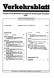 "content": "VerkehrsblatI\nAmtsblatt des Bundesministers für Verkehr der Bundesrepublik Deutschland\n (VkBI)\n\n INHALTSVERZEICHNIS\n\n\n\n\n 34. Jahrgang 1980 Ausgegeben zu Bonn am 15. Oktober 1980 Heft 19\n\n\n\n\n Nr. Datum VkB11980 Seite\n Amtlicher Teil\n\n Nr. Datum VkB11980 Seite 265 22.9.1980 Hiweis\n Verordnung Nr. 17/80 über die Festsetzung von Entgel\n ten für Verkehrsleistungen der Binnenschiffahrt vom 20.\n Allgemeine Angelegenhelten\n August 1980 680\n 257 10. 9.1980 Richtlinien für die Zulassung des Baumusters\n von Tankcontainern zur Beförderung gefährlicher Güter Seeverkehr\n (TC-Zulassungsrichtlinien - R 001 -) 672\n 266 11.9.1980 Ungültigkeitserklärung von Schiffsmeßbriefen 680\n\n Straßenverkehr\n Straßenbau\n 258 10. 9.1980 Änderung der Richtlinien für die Prüfung der\n Bewerber um eine Erlaubnis zum Führen von Kraftfahr 267 26.9. 1980 Allgemeines Rundschreiben Straßenbau\n zeugen (Prüfungsrichtlinien) vom 20. November 1970 Nr. 18/1980\n (VkBI S.887) 678 Sachgebiet 17: Vertrags- und Verdingungswesen 681\n 259 4. 9.1980 Sonntagsfahrverbot (§ 30 Abs. 3 StVO);\n hier: Wohnwagen hinter Lastkraftwagen 678 Aufgebote (nicht in Ausgabe B)\n 260 18. 9.1980 Bekanntmachung Nr. 19/80 über Sonderab 267a 15.10.1980 Aufbietung verlorener Fahrzeugbriefe\n machungen nach § 22a des Güterkraftverkehrsgesetzes 678 267b 15.10.1980 Aufbietung verlorener Führerscheine\n 267c 15.10.1980 Aufbietung von verlorenen Fahrzeug\n Binnenschiffahrt scheinen und Bescheinigungen über die Zuteilung\n 261 11.9.1980 Schiffahrtpolizeiliche Verordnung über die amtlicher Kennzeichen für zulassungsfreie Fahrzeuge\n Fahrt in den Mündungsstrecken der Ruhr und des 718a-718rrrrrrrr\n Rhein-Herne-Kanals 679\n 262 12.9.1980 I. Nachtrag\n zum Tarif für das Ufergeld in den im Lande Nordrhein-\n Westfalen gelegenen bundeseigenen Häfen an den\n abgabepflichtigen nordwestdeutschen Buncjeswasser-\n sträßen im Binnenbereich 679\n 263 17. 9.1980 I. Nachtragt\n zum Tarif für das Ufergeld in den in Niedersachsen und\n Hessen gelegenen bundeseigenen Häfen än den nord\n westdeutschen Bundeswasserstraßen im Binnenbereich 680\n 264 17.9.1980 Hinweis\n Nichtamtlicher Teil\n auf die Zweite Verordnung zur Änderung der Verordnung\n über die Befahrungsabgaben auf dem Nord-Ostsee- Fahrzeugtechnik 713\n Kanal 680 Rechtsprechung 716\n\n\n\n\n Beim Ausbleiben des Verkehrsblattes wollen sich die Bezieher bitte an den Verlag wenden.",