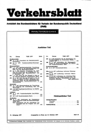 "content": "Verkehrsblall\nAmtsblatt des Bundesminlstere für Verkehr der Bundesrepublik Deutschland\n (VkBD\n\n INHALTSVERZEICHNIS\n\n\n\n\n Amtlidier Teil\n\n\n\n\n Nr. Datum VkBl 1977 Seite Nr. Datum VkBl 1977 Seite\n\n Straßenverkehr 279 8. 9. 1977 Merkblatt für die Beseitigung von\n Verschleißschäden an bituminösen Decken —\n 268 15. 9. 1977 Verzeichnis der Fahrlehrerausbil Ausgabe 1977 — 573\n dungsstätten 566\n 286 21. 9. 1977 Merkblätter für Eignungsprü\n 269 16. 9. 1977 Verkehrsrundfunk-Kennungs- fungen bei Bodenverfestigungen mit Zement\n system 566 und hochhydraulischem Kalk 573\n Binnenschiffahrt Personalnachrlchten\n 276 1. 9. 1977 Sdiiffahrtpolizeiliche Verordnung 281 13. 9. 1977 Personalnacdirichten 573\n über die Fahrt in den Mündungsstrecken der\n Ruhr und des Rhein-Herne-Kanals . . . . 569\n 271 14. 9. 1977 Hinweis Verordnung Nr. 14/77 281a 15. 10. 1977 Aufbietung verlorener Fahrzeug\n über die Festsetzung von Entgelten für Ver briefe\n kehrsleistungen der Binnenschiffahrt vom\n 6. September 1977 569 281b 15. 10. 1977 Aufbietung verlorener Führer\n scheine\n 272 7. 9. 1977 Tarif für das IJfergeld in den an\n der Oberelbe gelegenen bundeseigenen Häfen 569 281c 15. 10. 1977 Aufbietung von verlorenen Fahr-\n zeugs(^einen und Bescheinigungen über die\n 273 29. 9. 1977 Tarif für das Ufergeld in den im Zuteilung amtlicher Kennzeidien für zulas\n Lande Nordrhein-Westfalen gelegenen bun sungsfreie Fahrzeuge . . . . 580a—580kkkkkkk\n deseigenen Häfen an den abgabepflichtigen\n nordwestdeutsdien Bundeswasserstraßen im\n Binnenbereich • 570\n Seeverkehr\n 274 13. 9. 1977 Bekanntmachung der Verordnung\n zur Änderung der Lotsordnung Ems und\n Weser/Jade 570\n 275 9. 9. 1977 Ungültigkeitserklärung von Schiffs\n meßbriefen 571\n Luftfahrt\n 276 22. 9. 1977 Verkehrslandeplatz Leer-Nütter-\n moor 572\n 277 22. 9. 1977 Sonderlandeplatz Harle 572 Niditamtlidier Teil\n Straßenbau\n 278 15. 9. 1977 Änderungen der Umsatzsteuer Zeltschriftenschau\n (Mehrwertsteuer) durch das Steueränderungs\n Übersicht 574\n gesetz 1977;\n hier: Auswirkung auf die Abwicklung von Auslese 576\n Verträgen und die Vergabe von Auf\n trägen 572 Rechtsprechung 578\n\n\n\n\n 31. Jahrgang 1977 Ausgegeben zu Bonn am 15. Oktober 1977 Heft 19\n\n\n\n\n Verlagspostamt Dortmund. Beim Ausbleiben des Verkehrsblattes wollen Postbezieher sich lediglich an die liefernden Postämter wenden.",