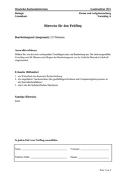 "content": "Hessisches Kultusministerium Landesabitur 2021 \nBiologie Thema und Aufgabenstellung \nGrundkurs Vorschlag A \nSeite 1 von 9 Hinweise für den Prüfling \n \nBearbeitungszeit (insgesamt): 255 Minuten \n \n \nAuswahlverfahren \nWählen Sie von den zwei vorliegenden Vorschlägen einen zur Bearbeitung aus. Der nicht ausgewählte \nVorschlag wird 60 Minuten nach Beginn der Bearbeitungszeit von der Aufsicht führenden Lehrkraft \neingesammelt. \n \n \nErlaubte Hilfsmittel \n1. ein Wörterbuch der deutschen Rechtschreibung \n2. ein eingeführter Taschenrechner (Bei grafikfähigen Rechnern und Computeralgebrasystemen ist \nein Reset durchzuführen.) \n3. eine Liste der fachspezifischen Operatoren \n \n \nSonstige Hinweise \nkeine \n \nIn jedem Fall vom Prüfling auszufüllen \n \n \nName: Vorname: \n \n \nPrüferin/Prüfer: Datum:",