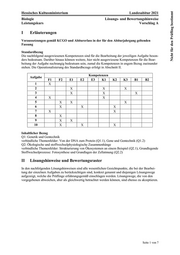 "content": "Nicht für den Prüfling bestimmt Hessisches Kultusministerium Landesabitur 2021 \nBiologie Lösungs- und Bewertungshinweise \nLeistungskurs Vorschlag A \nSeite 1 von 7I Erläuterungen \nVoraussetzungen gemäß KCGO und Abiturerlass in der für den Abiturjahrgang geltenden \nFassung \n \nStandardbezug \nDie nachfolgend ausgewiesenen Kompetenzen sind für die Bearbeitung der jeweiligen Aufgabe beson-\nders bedeutsam. Darüber hinaus können weitere, hier nicht ausgewiesene Kompetenzen für die Bear-\nbeitung der Aufgabe nachrangig bedeutsam sein, zumal die Kompetenzen in engem Bezug zueinander \nstehen. Die Operationalisierung des Standardbezugs erfolgt in Abschnitt II. \n \nAufgabe Kompetenzen \nF1 F2 E1 E2 E3 K1 K2 K3 B1 B2 \n1 X \n2 X X X \n3 X X X \n4 X X \n5 X X X \n6 X X X \n7 X X \n8 X \n9 X X \n10 X X X \n \nInhaltlicher Bezug \nQ1: Genetik und Gentechnik \nverbindliche Themenfelder: Von der DNA zum Protein (Q1.1), Gene und Gentechnik (Q1.2) \nQ2: Ökologische und stoffwechselphysiologische Zusammenhänge \nverbindliche Themenfelder: Strukturierung von Ökosystemen an einem Beispiel (Q2.1), Grundlegende \nStoffwechselprozesse: Fotosynthese und Grundlagen der Zellatmung (Q2.2) \n \nII Lösungshinweise und Bewertungsraster \nIn den nachfolgenden Lösungshinweisen sind alle wesentlichen Gesichtspunkte, die bei der Bearbei-\ntung der einzelnen Aufgaben zu berücksichtigen sind, konkret genannt und diejenigen Lösungswege \naufgezeigt, welche die Prüflinge erfahrungsgemäß einschlagen werden. Lösungswege, die von den \nvorgegebenen abweichen, aber als gleichwertig betrachtet werden können, sind ebenso zu akzeptieren.",