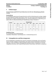 "content": "Nicht für den Prüfling bestimmt Hessisches Kultusministerium Landesabitur 2020 \nBiologie Lösungs- und Bewertungshinweise \nGrundkurs Vorschlag A2 \nSeite 1 von 5I Erläuterungen \nVoraussetzungen gemäß KCGO und Abiturerlass in der für den Abiturjahrgang geltenden \nFassung \n \nStandardbezug \nDie nachfolgend ausgewiesenen Kompetenzbereiche sind für die Bearbeitung der jeweiligen Aufgabe \nbesonders bedeutsam. Darüber hinaus können weitere, hier nicht ausgewiesene Kompetenzen für die \nBearbeitung der Aufgabe nachrangig bedeutsam sein, zumal die Kompetenzen in engem Bezug zuei-\nnander stehen. Die Operationalisierung des Standardbezugs erfolgt in Abschnitt II. \n \nAufgabe Kompetenzen \nF1 F2 E1 E2 E3 K1 K2 K3 B1 B2 \n1 X X \n2 X X \n3 X \n4 X X X X \n5 X X \n \nInhaltlicher Bezug \nQ3: Neurobiologie und Verhaltensbiologie \nverbindliche Themenfelder: Neurobiologie (Q3.1), Verhaltensbiologie (Q3.2) \n \n \nII Lösungshinweise und Bewertungsraster \nIn den nachfolgenden Lösungshinweisen sind alle wesentlichen Gesichtspunkte, die bei der Bearbei-\ntung der einzelnen Aufgaben zu berücksichtigen sind, konkret genannt und diejenigen Lösungswege \naufgezeigt, welche die Prüflinge erfahrungsgemäß einschlagen werden. Lösungswege, die von den \nvorgegebenen abweichen, aber als gleichwertig betrachtet werden können, sind ebenso zu akzeptieren.",