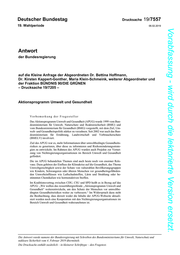 "content": "Deutscher Bundestag Drucksache 19/7557 19. Wahlperiode 06.02.2019 Vorabfassung - wird durch die lektorierte Version ersetzt. Antwort der Bundesregierung auf die Kleine Anfrage der Abgeordneten Dr. Bettina Hoffmann, Dr. Kirsten Kappert-Gonther, Maria Klein-Schmeink, weiterer Abgeordneter und der Fraktion BÜNDNIS 90/DIE GRÜNEN – Drucksache 19/7205 – Aktionsprogramm Umwelt und Gesundheit Vorbemerkung der Fragesteller Das Aktionsprogramm Umwelt und Gesundheit (APUG) wurde 1999 vom Bun- desministerium für Umwelt, Naturschutz und Reaktorsicherheit (BMU) und vom Bundesministerium für Gesundheit (BMG) vorgestellt, mit dem Ziel, Um- welt- und Gesundheitspolitik stärker zu verzahnen. Seit 2002 war auch das Bun- desministerium für Ernährung, Landwirtschaft und Verbraucherschutz (BMELV) involviert. Ziel des APUG war es, mehr Informationen über umweltbedingte Gesundheits- risiken zu generieren, über diese zu informieren und Risikominderungsstrate- gien zu entwickeln. Im Rahmen des APUG wurden auch Projekte zur Vernet- zung von Nichtregierungsorganisationen im Bereich Umwelt und Gesundheit gefördert. Die im APUG behandelten Themen sind auch heute noch von enormer Rele- vanz. Dazu gehören der Einfluss der Klimakrise auf die Gesundheit, das Thema Umweltgerechtigkeit sowie der Schutz von vulnerablen Bevölkerungsgruppen wie Kindern, Schwangeren oder älteren Menschen vor gesundheitsgefährden- den Umwelteinflüssen wie Luftschadstoffen, Lärm und Strahlung oder be- stimmten Chemikalien wie hormonaktiven Stoffen. Im Koalitionsvertrag zwischen CDU, CSU und SPD heißt es in Bezug auf das APUG: „Wir wollen das ressortübergreifende „Aktionsprogramm Umwelt und Gesundheit“ weiterentwickeln, um den Schutz der Menschen vor umweltbe- dingten Gesundheitsrisiken weiter zu verbessern.“ Im Widerspruch dazu steht die Beobachtung, dass derzeit weder die Inhalte der APUG-Webseite aktuali- siert werden noch eine Kooperation mit den Nichtregierungsorganisationen im Bereich Umwelt und Gesundheit wahrzunehmen ist. Die Antwort wurde namens der Bundesregierung mit Schreiben des Bundesministeriums für Umwelt, Naturschutz und nukleare Sicherheit vom 4. Februar 2019 übermittelt. Die Drucksache enthält zusätzlich – in kleinerer Schrifttype – den Fragetext.",