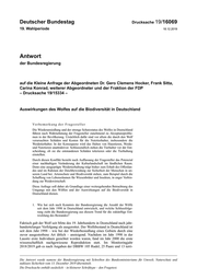 "content": "Deutscher Bundestag Drucksache 19/16069 19. Wahlperiode 18.12.2019 Antwort der Bundesregierung auf die Kleine Anfrage der Abgeordneten Dr. Gero Clemens Hocker, Frank Sitta, Carina Konrad, weiterer Abgeordneter und der Fraktion der FDP – Drucksache 19/15334 – Auswirkungen des Wolfes auf die Biodiversität in Deutschland Vorbemerkung der Fragesteller Die Wiederansiedlung und der strenge Schutzstatus des Wolfes in Deutschland führen nach Wahrnehmung der Fragesteller zunehmend zu Akzeptanzproble- men in der Bevölkerung. Ursächlich dafür sind vor allem die durch den Wolf verursachten Schäden und Kosten für die Nutztierhalter, insbesondere die Weidetierhalter. In der Konsequenz wird das Halten von Haustieren, Weide- und Nutztieren unattraktiver. Schlussendlich stehen die Tierhalter vor der Ent- scheidung, ob sie die entstandenen Schäden tolerieren oder die Tierhaltung einstellen. Durch diesen Konflikt besteht nach Auffassung der Fragesteller das Potenzial einer nachhaltigen Veränderung der Kulturlandschaft im ländlichen Raum. Denn eine ausgeprägte Weidetierhaltung trägt bisher zum Erhalt des Offenlan- des und im Rahmen der Deichbeweidung zur Sicherheit der Menschen in un- serem Land bei. Artenschutz und Biodiversität stehen, zum Beispiel durch die Schaffung von Lebensräumen für Wiesenbrüter und Insekten, in enger Verbin- dung zur Weidewirtschaft. Diese Anfrage soll daher als Grundlage einer weitergehenden Betrachtung des Umgangs mit den Wölfen und der Auswirkungen auf die Biodiversität in Deutschland dienen. 1. Wie hat sich nach Kenntnis der Bundesregierung die Anzahl der Wölfe seit dem Jahr 1998 in Deutschland entwickelt, und welche Schlussfolge- rung zieht die Bundesregierung aus diesem Trend für die zukünftige Ent- wicklung des Bestandes? Faktisch galt der Wolf seit Mitte des 19. Jahrhunderts in Deutschland nach jahr- hundertelanger Verfolgung als ausgerottet. Der Wolfsbestand in Deutschland ist seit dem Jahr 1998 – wie bei der Wiederbesiedlung eines Gebiets durch eine zuvor ausgestorbene Art üblich – ansteigend. Nachdem im Jahr 1998 in der Lausitz erste Individuen gesichtet worden waren, fand im Jahr 2000 die erste wissenschaftlich nachgewiesene Reproduktion statt. Im Monitoringjahr 2018/2019 gab es nach Angaben der DBBW 105 Rudel, 25 Paare und 13 terri- Die Antwort wurde namens der Bundesregierung mit Schreiben des Bundesministeriums für Umwelt, Naturschutz und nukleare Sicherheit vom 13. Dezember 2019 übermittelt. Die Drucksache enthält zusätzlich – in kleinerer Schrifttype – den Fragetext.",