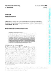 "content": "Deutscher Bundestag Drucksache 19/14264 19. Wahlperiode 21.10.2019 Vorabfassung - wird durch die lektorierte Version ersetzt. Antwort der Bundesregierung auf die Kleine Anfrage der Abgeordneten Frank Pasemann, Martin Hess, Sebastian Münzenmaier, weiterer Abgeordneter und der Fraktion der AfD – Drucksache 19/13711 – Neubewertung der Sicherheitslage in Syrien Vorbemerkung der Fragesteller Im März 2019 wurde laut Presseberichten durch das Bundesamt für Migration und Flüchtlinge (BAMF) eine Aktualisierung der Herkunftsländerleitsätze in Bezug auf das Herkunftsland Syrien vorgenommen (www.tagesschau.de/in land/syrien-bamf-sicherheitslage-asylentscheide-101.html). Eine dahingehend abschließende Billigung oder Entscheidung durch die Leitung des Bundesmi- nisteriums des Innern, für Bau und Heimat liegt nach Ansicht der Fragesteller noch nicht vor, jedoch soll diese laut übereinstimmenden Medienberichten bis Herbst 2019 im Zuge einer Neubewertung der Sicherheitslage Syriens durch die Bundesregierung erfolgen (vgl. etwa www.br.de/nachrichten/deutschland- welt/seehofer-will-syrische-heimaturlauber-abschieben,RZTKqNH). Vorbemerkung der Bundesregierung Das Bundesamt für Migration und Flüchtlinge (BAMF) ist aus nationalem Recht und Unionsrecht verpflichtet, die im Asylverfahren vorgetragenen Sach- verhalte umfassend aufzuklären und den Entscheiderinnen und Entscheidern für diese Aufgabe genaue und aktuelle Informationen zur Situation in den Her- kunftsländern aus relevanten Quellen intern bereitzustellen, die für die Beurtei- lung von Schutzmöglichkeiten notwendig sind. Es handelt sich um eine Dauer- aufgabe des BAMF, die eine fortlaufende Aktualisierung der Informationen er- fordert. Das BAMF nimmt im Prozess der Informationsgewinnung alle verfüg- baren Informationen zur Kenntnis und ermittelt daraus die relevanten Quellen. Diese werden den Herkunftsländer-Leitsätzen zugrunde gelegt, die das BAMF als sachkundige und verantwortliche Bundesoberbehörde erstellt, damit eine bundesweit einheitliche Entscheidungspraxis auf gesicherter Grundlage stattfin- den kann. Dabei regeln die Leitsätze die Behandlung der vorgetragenen typi- schen Fallkonstellationen bezogen auf die zu prüfenden Rechtsgrundlagen zum Flüchtlingsschutz, subsidiären Schutz und Abschiebeverboten. Die in der Fra- gestellung angesprochene Sicherheitslage in Syrien spielt eine wichtige Rolle für die Herkunftsländer-Leitsätze, ist aber für die Entscheidung des BAMF nicht alleine entscheidend. Die Antwort wurde namens der Bundesregierung mit Schreiben des Bundesministeriums des Innern, für Bau und Heimat vom 17. Oktober 2019 übermittelt. Die Drucksache enthält – in kleinerer Schrifttype – den Fragetext.",