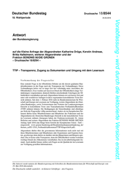 "content": "Deutscher Bundestag Drucksache 18/8544 18. Wahlperiode 24.05.2016 Vorabfassung - wird durch die lektorierte Version ersetzt. Antwort der Bundesregierung auf die Kleine Anfrage der Abgeordneten Katharina Dröge, Kerstin Andreae, Britta Haßelmann, weiterer Abgeordneter und der Fraktion BÜNDNIS 90/DIE GRÜNEN – Drucksache 18/8294 – TTIP – Transparenz, Zugang zu Dokumenten und Umgang mit dem Leseraum Vorbemerkung der Fragesteller Eine zentrale Frage in der öffentlichen Debatte um die derzeit geplanten Han- delsabkommen ist die Frage nach der Transparenz der Verhandlungen. Diese Verhandlungen liefen viel zu lange Zeit fast vollständig unter Ausschluss der Öffentlichkeit. Zwar wurden auf massiven Druck der Öffentlichkeit einige Ver- änderungen vorgenommen, dennoch bleiben entscheidende Unterlagen der Öf- fentlichkeit vorenthalten und auch Abgeordnete können erst seit kurzer Zeit und unter sehr restriktiven Auflagen in diese sogenannten konsolidierten Texte Ein- sicht nehmen. Seit dem 1. Februar 2016 steht im Bundesministerium für Wirt- schaft und Energie ein Leseraum zur Verfügung, in dem Abgeordnete des Deut- schen Bundestages, sowie Vertreterinnen und Vertreter der Landesregierungen Einsicht in konsolidierte Texte zum Transatlantischen Freihandelsabkommen (TTIP) nehmen können. Die Bedingungen der Einsichtnahme sind allerdings aus Sicht der Fragesteller völlig unzureichend. Anders als im Europäischen Par- lament dürfen keine Mitarbeiterinnen und Mitarbeiter der Fraktionen und der Abgeordneten des Deutschen Bundestages Einsicht in die konsolidierten Texte im Leseraum nehmen (hiergegen haben der Fraktionsvorsitzende Dr. Anton Hofreiter und weitere Abgeordnete der Fraktion BÜNDNIS 90/DIE GRÜNEN Anfang April 2016 eine Klage beim Gericht der Europäischen Union – EuG – eingereicht: www.gruene-bundestag.de/fileadmin/media/gruenebundestag_de/ themen_az/EU-USA_Freihandelsabkommen/TTIP-Klageschrift.pdf). Abgeordnete dürfen über die gewonnenen Informationen noch nicht mal mit ihren Mitarbeiterinnen und Mitarbeitern oder Expertinnen und Experten bera- ten, geschweige denn dürfen sie darüber mit den Bürgerinnen und Bürgern spre- chen. Das ist keine echte Transparenz, denn der Öffentlichkeit werden weiterhin wichtige Details des Abkommens vorenthalten. Das ist ein unbefriedigender Zu- stand. Auch darüber hinaus stellen sich Fragen an die Qualität der im Leseraum zur Verfügung gestellten Informationen. Die Antwort wurde namens der Bundesregierung mit Schreiben des Bundesministeriums für Wirtschaft und Energie vom 19. Mai 2016 übermittelt. Die Drucksache enthält zusätzlich – in kleinerer Schrifttype – den Fragetext.",