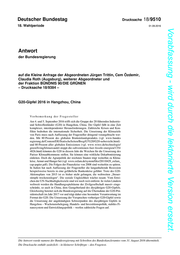 "content": "Deutscher Bundestag Drucksache 18/9510 18. Wahlperiode 01.09.2016 Vorabfassung - wird durch die lektorierte Version ersetzt. Antwort der Bundesregierung auf die Kleine Anfrage der Abgeordneten Jürgen Trittin, Cem Özdemir, Claudia Roth (Augsburg), weiterer Abgeordneter und der Fraktion BÜNDNIS 90/DIE GRÜNEN – Drucksache 18/9384 – G20-Gipfel 2016 in Hangzhou, China Vorbemerkung der Fragesteller Am 4. und 5. September 2016 trifft sich die Gruppe der 20 führenden Industrie- und Schwellenländer (G20) in Hangzhou, China. Der Gipfel fällt in eine Zeit komplexer, interdependenter Herausforderungen. Zahlreiche Krisen und Kon- flikte bedrohen die internationale Sicherheit. Die Umsetzung der Klimaziele von Paris muss nach Auffassung der Fragesteller dringend vorangebracht wer- den. Mit 80 Prozent des globalen Bruttoinlandsprodukts (vgl. www.bundes regierung.de/Content/DE/StatischeSeiten/Breg/G7G20/G20-uebersicht.html) und 80 Prozent aller globalen Emissionen (vgl. www.wiwo.de/technologie/ green/living/klimawandel-stoppt-die-subventionen-fuer-fossile-energien/1354 4826.html) könnten die G20 in diesem Jahr die Weichen für die Umsetzung des Pariser Klimaabkommens stellen. Sie können eine wirkliche Dekarbonisierung einleiten. Doch die Agrarpolitik der reichsten Staaten trägt weiterhin zu Klima- krise, Armut und Hunger bei (vgl. www.oxfam.de/system/files/20110429_oxfam_ cap-papier.pdf). Die Folgen der Finanzkrise von 2008 sind weiterhin zu spüren. In Italien hat nach Auffassung der Fragesteller die langanhaltende Rezession beispielsweise bereits in eine gefährliche Bankenkrise geführt. Trotz des G20- Aktionsplans von 2015 ist es bisher nicht gelungen, die weltweiten „Steuer- sümpfe trockenzulegen“. Die soziale Ungleichheit wächst rasant. Vom Errei- chen der UN-Nachhaltigkeitsziele sind wir noch weit entfernt. In vielen Ländern weltweit werden die Handlungsspielräume der Zivilgesellschaft massiv einge- schränkt, so auch in China, dem Gastgeberland des diesjährigen G20-Gipfels. Gleichzeitig bereitet sich die Bundesregierung auf die Übernahme der G20-Prä- sidentschaft im Jahr 2017 vor und trägt daher eine besondere Verantwortung im Format der G20. Die Umsetzung der Versprechen vorheriger G20-Gipfel sowie die Umsetzung der angekündigten Schwerpunkte des diesjährigen Gipfels in Hangzhou – Wachstumsbelegung, Handels- und Investitionspolitik, stabiles Fi- nanzsystem und Entwicklungspolitik – werfen zahlreiche Fragen auf. Die Antwort wurde namens der Bundesregierung mit Schreiben des Bundeskanzleramtes vom 31. August 2016 übermittelt. Die Drucksache enthält zusätzlich – in kleinerer Schrifttype – den Fragetext.",