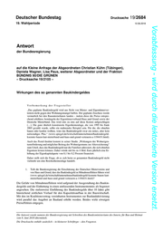 "content": "Deutscher Bundestag Drucksache 19/2684 19. Wahlperiode 12.06.2018 Vorabfassung - wird durch die lektorierte Version ersetzt. Antwort der Bundesregierung auf die Kleine Anfrage der Abgeordneten Christian Kühn (Tübingen), Daniela Wagner, Lisa Paus, weiterer Abgeordneter und der Fraktion BÜNDNIS 90/DIE GRÜNEN – Drucksache 19/2105 – Wirkungen des so genannten Baukindergeldes Vorbemerkung der Fragesteller „Das geplante Baukindergeld wird aus Sicht von Mieter- und Eigentümerver- tretern nicht gegen den Wohnungsmangel helfen. Der geplante Zuschuss werde vermutlich bei den Bauunternehmen landen – indem diese die Preise entspre- chend erhöhten, bemängeln der Eigentümerverband Haus und Grund sowie der Deutsche Mieterbund. Das wird eins zu eins auf diese Kosten aufgeschlagen (…), Die ganz ähnlich konstruierte Eigenheimzulage, die von 1995 bis Ende 2005 gezahlt wurde, sollte ein mahnendes Beispiel sein. Für die, die ohnehin bauen oder kaufen wollten, wäre das Baukindergeld zwar ein nettes, aber kein notwendiges Plus.“ (www.spiegel.de/wirtschaft/unternehmen/baukindergeld- koennte-bauen-laut-mieterbund-und-haus-und-grund-verteuern-a-1194431.html). Auch das Pestel-Institut kommt in seiner Studie „Wirkungen der Wohneigen- tumsförderung und möglicher Beitrag des Wohneigentums zur Alterssicherung“ zum Urteil, dass das Baukindergeld nur die Familien adressiert, die sich ohnehin Eigentum leisten können. Daher würde mit bis zu 4 Mrd. Euro jährlich eine Er- höhung der Eigenkapitalquote von 0,1 bis 0,2 Prozent finanziert. Daher stellt sich die Frage, ob es sich beim so genannten Baukindergeld nicht vielmehr um eine Reichenheimzulage handelt. 1. Teilt die Bundesregierung die Einschätzung des Deutschen Mietervereins und von Haus und Grund, dass das Baukindergeld zu Mitnahmeeffekten führen wird (www.spiegel.de/wirtschaft/unternehmen/baukindergeld-koennte-bauen-laut- mieterbund-und-haus-und-grund-verteuern-a-1194431.html)? Die Gefahr von Mitnahmeeffekten wird aufgrund der Ausgestaltung des Baukin- dergelds und der Einbettung in einen umfassenden Instrumentenmix als begrenzt angesehen. Die stufenweise Einführung des Baukindergelds über 10 Jahre gibt hinreichend zeitlichen Vorlauf für den Kapazitätsaufbau in der Bauwirtschaft. Mit den im Koalitionsvertrag vereinbarten Instrumenten zur Baulandaktivierung wird parallel das Angebot an Bauland erhöht werden. Beides wirkt etwaigen Preiseffekten entgegen. Die Antwort wurde namens der Bundesregierung mit Schreiben des Bundesministeriums des Innern, für Bau und Heimat vom 8. Juni 2018 übermittelt. Die Drucksache enthält zusätzlich – in kleinerer Schrifttype – den Fragetext.",