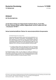 "content": "Deutscher Bundestag Drucksache 19/15289 19. Wahlperiode 19.11.2019 Antwort der Bundesregierung auf die Kleine Anfrage der Abgeordneten Karlheinz Busen, Frank Sitta, Dr. Gero Clemens Hocker, weiterer Abgeordneter und der Fraktion der FDP – Drucksache 19/14817 – Verlust landwirtschaftlicher Flächen für naturschutzrechtliche Kompensation Vorbemerkung der Fragesteller Naturschutzrechtlich sind Eingriffe in Natur und Umwelt grundsätzlich zu ver- meiden. Der Verursacher unvermeidbarer Beeinträchtigungen muss diese durch Maßnahmen des Naturschutzes und der Landschaftspflege ausgleichen oder ersetzen (kompensieren). Für solche Maßnahmen werden vielfach land- wirtschaftliche Flächen angekauft und naturschutzrechtlich aufgewertet. Eine landwirtschaftliche Fläche, die etwa für den naturschutzrechtlichen Ausgleich aufgeforstet wird, ist auf Dauer der landwirtschaftlichen Nutzung entzogen. 1. In welchem Umfang wurden in den Jahren 2015 bis 2019 vom Bund land- wirtschaftliche Flächen als Kompensationsflächen für den Bau von Straßen des Bundes erworben und im Rahmen der Kompensationsmaßnahme ganz oder teilweise der landwirtschaftlichen Nutzung entzogen? Die Bundesfernstraßen werden von den Ländern im Auftrag des Bundes ge- plant, gebaut, unterhalten und verwaltet. Die Bundesregierung hat keine Kennt- nis über den genauen Umfang der für den Bau von Bundesfernstraßen erworbe- nen und der landwirtschaftlichen Nutzung entzogenen Flächen. Die Antwort wurde namens der Bundesregierung mit Schreiben des Bundesministeriums für Ernährung und Landwirtschaft vom 18. November 2019 übermittelt und mit Schreiben vom 4. Dezember 2019 nachgereicht. Die Drucksache enthält – in kleinerer Schrifttype – den Fragetext.",