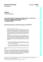 "content": "Drucksache 18/9961 –4– Deutscher Bundestag – 18. Wahlperiode Vorabfassung - wird durch die lektorierte Version ersetzt. 11. Wurden Radwege an Bundesfernstraßen bzw. Radschnellwege bzw. der Bau dieser bei der im Gesetz über die Umweltverträglichkeitsprüfung (UVPG) vorgeschriebenen Alternativenprüfung, die vorschreibt, dass „insbesondere alternative Verkehrsnetze und alternative Verkehrsträger ermittelt, beschrie- ben und bewertet“ (UVPG § 19b, Absatz 2) werden sollen, bei der Bewer- tung und Einstufung einzelner Straßenneu- und Ausbaubauprojekte im neuen Bundesverkehrswegeplan berücksichtigt? Wenn ja, bei welchen Straßenneu- und Ausbauprojekten? Wenn nein, warum nicht? Die Fragen 8 bis 11 werden wegen ihres Sachzusammenhangs gemeinsam beant- wortet. Wie im Bundesverkehrswegeplan (BVWP) 2030 ausgeführt, ist der Bund verant- wortlich für die Finanzierung von Bau und Erhalt der Bundesverkehrswege. Der Bund ergreift darüber hinaus jedoch noch zahlreiche weitere Maßnahmen, die zur Weiterentwicklung der Verkehrswege und ihrer effizienten Nutzung beitragen. Diese sind im BVWP 2030 dargestellt. Hierbei geht es auch um eine nachhaltige, ökologische und sichere Mobilität. Vor diesem Hintergrund sind Ausführungen zu Radschnellwegen in Kapitel 9 des BVWP 2030 enthalten. 12. Über welchen Haushaltstitel möchte die Bundesregierung die ab dem Jahr 2017 in Aussicht gestellten 25 Mio. Euro für Radschnellwege finanzieren (www.bmub.bund.de/presse/pressemitteilungen/pm/artikel/hendricks-und- groschek-radschnellwege-sind-wichtiger-baustein-fuer-verkehrssystem-der- zukunft/)? Die Veranschlagung von Zuweisungen an die Länder zum Bau von Radschnell- wegen ist Gegenstand der laufenden parlamentarischen Beratungen zum Bundes- haushalt 2017. 13. Welche Radschnellwegprojekte in Deutschland sind der Bundesregierung bekannt, und welche davon kommen aus Sicht der Bundesregierung für eine Förderung durch Bundesmittel in Frage? 14. Verfügt die Bundesregierung über konkrete Planungen und Vorschläge zu Radverkehrsprojekten, die nach Schaffung der rechtlichen Grundlagen um- gesetzt werden sollen? Wenn ja, welche (bitte Nennung der mit Strecke, Länge und den voraussicht- lichen Investitionskosten)? Die Fragen 13 und 14 werden wegen ihres Sachzusammenhangs gemeinsam be- antwortet. In zahlreichen Städten und Regionen Deutschlands, wie z. B. in der Region Nürn- berg, im Ruhrgebiet, Frankfurt, Hamburg, Berlin werden Radschnellwege ge- plant. Eine Entscheidung über die Förderfähigkeit von konkreten Projekten wird erst nach Inkrafttreten einer in der Antwort auf die Fragen 5 und 6 beschriebenen Gesetzesänderung und nach Vorliegen der Förderkriterien getroffen werden kön- nen. Satz: Satzweiss.com Print, Web, Software GmbH, Mainzer Straße 116, 66121 Saarbrücken, www.satzweiss.com Druck: Printsystem GmbH, Schafwäsche 1-3, 71296 Heimsheim, www.printsystem.de Vertrieb: Bundesanzeiger Verlag GmbH, Postfach 10 05 34, 50445 Köln, Telefon (02 21) 97 66 83 40, Fax (02 21) 97 66 83 44, www.betrifft-gesetze.de ISSN 0722-8333",