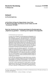 "content": "Deutscher Bundestag Drucksache 19/15794 19. Wahlperiode 10.12.2019 Antwort der Bundesregierung auf die Kleine Anfrage der Abgeordneten Joana Cotar, Dr. Michael Espendiller, Uwe Schulz und der Fraktion der AfD – Drucksache 19/15409 – Stand der Umsetzung der Umsetzungsstrategie der Bundesregierung „Digitalisierung gestalten“ – Gestaltung einer digitalen Ordnungspolitik Vorbemerkung der Fragesteller Im August 2014 veröffentlichte die Bundesregierung das Strategiepapier „Di- gitale Agenda 2014 – 2017“ (www.bmwi.de/Redaktion/DE/Publikationen/Dig itale-Welt/digitale-agenda.pdf?__blob=publicationFile&v=3), das federfüh- rend vom Bundesministerium für Wirtschaft und Energie, vom Bundesminis- terium des Innern, für Bau und Heimat und vom Bundesministerium für Ver- kehr und digitale Infrastruktur verantwortet wurde. Die Veröffentlichung einer Digitalstrategie für Deutschland erfolgte damit vier Jahre später als die Verab- schiedung der „Digital Agenda for Europe“ der EU-Kommission im Jahr 2010 (https://eur-lex.europa.eu/LexUriServ/LexUriServ.do?uri=COM:2010:0245:FI N:DE:PDF) und nach Auffassung der Fragesteller mindestens zehn Jahre zu spät für eine richtungsweisende Digitalpolitik zum Wohl unserer Gesellschaft, der öffentlichen Verwaltung und des Wirtschaftsstandortes Deutschland. In Fachmedien wurde an der „Digitalen Agenda 2014 – 2017“ kritisiert, sie sei lediglich eine Bestandsaufnahme der Problemlagen und Möglichkeiten und enthalte nur wenige konkrete Lösungsvorschläge (www.golem.de/news/digita le-agenda-ein-papier-das-alle-enttaeuscht-1408-108715.html). Die Umsetzung der „Digitalen Agenda 2014 – 2017“ nach dem ersten Jahr war „ernüchternd“ (www.zeit.de/digital/internet/2015-08/digitale-agenda-bundesregierung-breitb and-wlan). Die Gesamtbilanz wurde von öffentlich-rechtlichen Medien als „durchwachsen“ bewertet (www.zdf.de/nachrichten/heute/braun-kuendigt-neu e-digitale-agenda-an-100.html). Im Jahr 2009 hatte Bundeskanzlerin Dr. Angela Merkel bereits versprochen, dass 75 Prozent der deutschen Haushalte bis 2014 Internetanschlüsse mit einer Geschwindigkeit von 50 Mbit pro Sekunde bekommen – ein Versprechen von Bundeskanzlerin Dr. Angela Merkel, das nicht gehalten wurde (www.sueddeut sche.de/politik/netzpolitik-von-union-und-spd-stunde-der-nerds-1.1802641). Im Jahr 2014 versprach Bundeskanzlerin Dr. Angela Merkel in ihrer Regie- rungserklärung nun sogar, dass alle deutschen Haushalte bis 2018 Internetan- schlüsse mit einer Geschwindigkeit von 50 Mbit pro Sekunde bekommen – ein weiteres Versprechen von Bundeskanzlerin Dr. Angela Merkel, das nicht Die Antwort wurde namens der Bundesregierung mit Schreiben des Bundesministeriums für Wirtschaft und Energie vom 2. Dezember 2019 übermittelt. Die Drucksache enthält zusätzlich – in kleinerer Schrifttype – den Fragetext.",