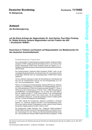 "content": "Deutscher Bundestag Drucksache 19/10462 19. Wahlperiode 24.05.2019 Vorabfassung - wird durch die lektorierte Version ersetzt. Antwort der Bundesregierung auf die Kleine Anfrage der Abgeordneten Dr. Axel Gehrke, Paul Viktor Podolay, Dr. Robby Schlund, weiterer Abgeordneter und der Fraktion der AfD – Drucksache 19/9940 – Koran-Sure in Türkisch und Deutsch auf Beipackzetteln von Medikamenten für den deutschen Arzneimittelmarkt Vorbemerkung der Fragesteller Das in Deutschland in Verkehr gebrachte Fertigarzneimittel „Pankreatin Mikro- ratiopharm 20 000“ enthält den Wirkstoff Pankreas-Pulver vom Schwein (Pan- kreatin) entsprechend 20 000 Ph.Eur.-Einheiten Lipase pro Kapsel ( w w w . ratiopharm.de/produkte/praeparate-details/praeparate/praeparatedaten/detail/pzn- 7097563.html). Das Fertigarzneimittel „Pankreatin Mikro-ratiopharm 20 000“ wurde von der zuständigen Bundesoberbehörde, dem Bundesinstitut für Arzneimittel und Me- dizinprodukte (BfArM) unter der Zulassungsnummer 6760053.00.00 amtlich zugelassen. Teil der amtlichen Zulassung ist neben der Beschriftung der Faltschachtel und dem Text der Fachinformation auch der Text der Packungsbeilage (§ 22 Ab- satz 7 des Arzneimittelgesetzes – AMG). Näheres zur Gestaltung der Packungsbeilage regelt das BfArM in der „Bekannt- machung von Empfehlungen zur Gestaltung von Packungsbeilagen nach § 11 des Arzneimittelgesetzes (AMG) für Humanarzneimittel (gemäß § 77 Absatz 1 AMG) und zu den Anforderungen § 22 Absatz 7 Satz 2 AMG (Überprüfung der Verständlichkeit von Packungsbeilagen)“ vom 14. April 2015. Dort heißt es, über die Angaben gemäß § 11 AMG hinaus könnten in der Packungsbeilage weitere Angaben gemacht werden. Diese müssten dann, „für die gesundheitli- che Aufklärung wichtig sein“. Zu den dort genannten weiteren Vorgaben gehört auch der „Verzicht auf inhaltliche Wiederholungen“. § 11 AMG schreibt die Formulierung „allgemein verständlich in deutscher Sprache“ vor. „Sofern die Angaben nach Satz 1 in der Packungsbeilage zusätz- lich in einer anderen Sprache wiedergegeben werden, müssen in dieser Sprache die gleichen Angaben gemacht werden“, heißt es weiter. ® Der Beipackzettel enthält folgenden Text: „Pankreatin Mikro-ratiopharm 20 000 enthält wirksame Enzyme der Bauchspeicheldrüse vom Schwein, die ei- nen Enzymmangel bei einer Störung der Bauchspeicheldrüsenfunktion behe- ® ben. Auch muslimische Patienten dürfen Pankreatin Mikro-ratiopharm 20 000 Die Antwort wurde namens der Bundesregierung mit Schreiben des Bundesministeriums für Gesundheit vom 24. Mai 2019 übermittelt. Die Drucksache enthält zusätzlich – in kleinerer Schrifttype – den Fragetext.",