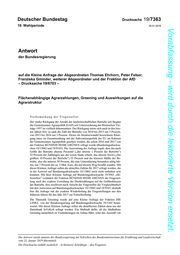"content": "Drucksache 19/7363 –6– Deutscher Bundestag – 19. Wahlperiode Vorabfassung - wird durch die lektorierte Version ersetzt. Um die bereits in der Antwort zu Frage 2 beschriebenen Informationslücken zu schließen, hat das Bundesministerium für Ernährung und Landwirtschaft die Res- sortforschung gebeten, Analysen zum Umfang von Anteilskäufen mit Eigentum an landwirtschaftlichen Nutzflächen durchzuführen. Dazu hat das Thünen-Institut in 10 Landkreisen in den ostdeutschen Ländern über 11 Jahre hinweg alle An- teilskäufe von juristischen Personen ausgewertet. Die Analyse kann eine amtliche Statistik nicht ersetzen, sie ergibt aber aufgrund des langen Untersuchungszeit- raums, aufgrund der regionalen Verteilung der Landkreise und des mit 709 000 ha großen Umfangs der einbezogenen Flächen ein realistisches Bild der Entwicklung in Ostdeutschland bis zum Jahr 2017. Für einzelne Jahre schätzt das Thünen- Institut den Anteil von Flächenübertragungen im Vergleich zu den amtlich erfass- ten Einzelflächenverkäufen wie folgt ein: 2009: 8 Prozent; 2011: 24 Prozent; 2015: 8 Prozent; 2016: 51 Prozent. Im Durchschnitt der Jahre hat das Thünen- Institut einen Anteil von 18 Prozent ermittelt. Das Thünen-Institut geht aber da- von aus, dass dieser Wert in Zukunft deutlich zunehmen wird. Ausführliche Er- gebnisse dazu finden sich im Thünen-Report 52, „Überregional aktive Kapitalei- gentümer in ostdeutschen Agrarunternehmen: Entwicklungen bis 2017“, A. Tietz, Braunschweig, 2017, S. 44 f. Für westdeutsche Länder liegen weder Statistiken noch Fallstudien vor. 5. In welchen Fällen und wie viele Hektare pro Jahr und Bundesland betreffend kam dabei das Grundstücksverkehrsgesetz zur Geltung und bei welchen Fäl- len und wie viele Hektaren pro Jahr und Bundesland nicht? Bei keinem der Fälle von Anteilsverkäufen bzw. Gesellschafterwechseln bei landwirtschaftlichen Betrieben in Form von juristischen Personen kam aufgrund der in der Antwort zu Frage 2 beschriebenen Regulierungslücke bislang das Grundstückverkehrsgesetz zur Geltung. Das Eigentum an den Eigentumsflächen der jeweiligen juristischen Personen wechselt mit dem Wechsel der die juristische Person beherrschenden Mehrheiten, ohne dass dies den Behörden bekannt wird. Deshalb können in derartigen Fällen die agrarstrukturellen Ziele des landwirt- schaftlichen Bodenrechts (z. B. Vorrang für Landwirte; Verhinderung von Preis- missbrauch) weder geprüft noch durchgesetzt werden. Die Schließung dieser Re- gulierungslücke durch die dafür zuständigen Länder ist deshalb wünschenswert. 6. Wie viele Betriebe (absolut und prozentual) wären im Jahr 2017 nach Kennt- nis der Bundesregierung von einer Kappung der flächengebundenen Zahlun- gen betroffen gewesen (bitte nach Bundesländern aufschlüsseln, nach Zahl der Betriebe, dem Kürzungsvolumen bei einer Kappung ab 60 000 Euro und ab 150 000 Euro)? Das EU-Recht sieht vor, dass die Mitgliedstaaten bei der Basisprämie – nicht je- doch bei den übrigen Direktzahlungen wie Greeningprämie, Junglandwirteprämie und Umverteilungsprämie – die Teilbeträge der einem Betriebsinhaber ansonsten zustehenden Zahlungen oberhalb von 150 000 Euro um mindestens 5 Prozent kür- zen, sofern sie nicht eine Umverteilungsprämie in Höhe von mehr als 5 Prozent der nationalen Obergrenze gewähren. Sie können auch höhere Kürzungssätze bis zu 100 Prozent (Kappung) festlegen, gestaffelte Kürzungssätze in Abhängigkeit vom Prämienvolumen festlegen sowie die im Zusammenhang mit einer landwirt- schaftlichen Tätigkeit gezahlten Löhne berücksichtigen. Im Folgenden werden die Kürzungsbeträge für die EU-rechtlich zulässige Variante 100 Prozent Kür- zung oberhalb von 150 000 Euro ausgewiesen. Für die EU-rechtlich nicht zuläs-",