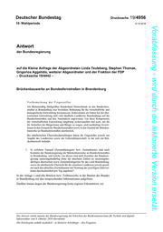 "content": "Deutscher Bundestag Drucksache 19/4956 19. Wahlperiode 12.10.2018 Vorabfassung - wird durch die lektorierte Version ersetzt. Antwort der Bundesregierung auf die Kleine Anfrage der Abgeordneten Linda Teuteberg, Stephan Thomae, Grigorios Aggelidis, weiterer Abgeordneter und der Fraktion der FDP – Drucksache 19/4442 – Brückenbauwerke an Bundesfernstraßen in Brandenburg Vorbemerkung der Fragesteller Als flächenmäßig fünftgrößtes Bundesland Deutschlands ist den Bundesfern- straßen in Brandenburg eine besondere Bedeutung für die wirtschaftliche und demografische Entwicklung beizumessen. Insbesondere als Faktor bei der öko- nomischen Entwicklung sind viele ländliche Landkreise Brandenburgs auf die Bundesfernstraßen und ihre Nutzbarkeit angewiesen. Um diese Komponente der wirtschaftlichen Entwicklung langfristig sicherzustellen und auch, um für die Sicherheit der Bürgerinnen und Bürger zu sorgen, sind nachhaltige Investi- tionen in den Zustand der Bundesfernstraßen sowie in den Zustand der Brücken- bauwerke an Bundesfernstraßen unerlässlich. Bei tabellarischen Übersichtsdarstellungen bitten die Fragesteller jeweils um Angabe des Landkreises sowie der Gebietskörperschaft, in der sich ein Brü- ckenbauwerk befindet. 1. In welchem Zustand (Zustandskategorie bzw. Zustandsnote) sind nach Kenntnis der Bundesregierung die Brückenbauwerke an Bundesfernstraßen in Brandenburg, und welche von diesen sind nach Kenntnis der Bundesre- gierung sanierungsbedürftig (bitte die absoluten Zahlen zu sanierungsbe- dürftigen Bauwerken sowie Zustandskategorien für das Land Brandenburg, sowie als tabellarische Übersicht für die einzelnen Landkreise jeweils geord- net nach den aktuellen Zustandsnoten mit Nennung der jeweiligen Güterver- kehre durchschnittlich pro Tag angeben)? In der Anlage 1 sind alle Brücken bzw. Teilbauwerke in der Baulast des Bundes in Brandenburg mit den entsprechenden Informationen aufgelistet. Darüber hinaus liegen der Bundesregierung keine eigenen Erkenntnisse vor. Die Antwort wurde namens der Bundesregierung mit Schreiben des Bundesministeriums für Verkehr und digitale Infrastruktur vom 9. Oktober 2018 übermittelt. Die Drucksache enthält zusätzlich – in kleinerer Schrifttype – den Fragetext.",