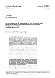 "content": "Drucksache 19/16416 –2– Deutscher Bundestag – 19. Wahlperiode Verabschiedung des Klimapaketes ein Mehr an Klimaschutz zu erreichen, in- klusive der expliziten Zielsetzung von 65 Prozent erneuerbare Energien bis 2030, droht so aus Sicht der Fragestellenden ein schwerwiegender und lang- fristiger Rückschlag beim Ausbau der erneuerbaren Energien. 1. Liegen der Bundesregierung Berechnungen vor, wie viel Fläche und damit einhergehend wie viel potenzielle Ausbaukapazität von Windenergieanla- gen durch die von ihr im Referentenentwurf des Kohleausstiegsgesetzes vorgesehen Mindestabstands von Windenergieanlagen von einem Kilome- ter zu fünf Wohngebäuden verloren ginge, und welcher Gesamtausbau mit diesen Abständen noch möglich wäre (bitte in Quadratmeter und Mega- watt angeben)? Die Ressortabstimmungen zu der vorgesehenen Mindestabstandsregelung für Windenenergie dauern noch an. Die Bundesregierung nimmt zu laufenden Res- sortverhandlungen nicht Stellung, die Ergebnisse sind zunächst abzuwarten. Ei- ne unmittelbare Abschätzung der Auswirkungen der in der Bundesregierung diskutierten Regelungsentwürfe ist auf Basis der Ergebnisse vorliegender Gut- achten nicht möglich, da die in den Gutachten untersuchten Flächenkategorien und Szenarien nicht identisch sind mit den Vorgaben des Klimaschutzpro- gramms 2030. 2. Wie bewertet die Bundesregierung die Ergebnisse der wissenschaftlichen Analyse im Auftrag des Umweltbundesamtes „Analyse der kurz- und mit- telfristigen Verfügbarkeit von Flächen für die Windenergienutzung an Land“ (Climate Change 38/2019), der zufolge mit einer pauschalen Ab- standsregel von 1000 Meter zur Wohnbebauung die Ausbauziele der Bundesregierung 65 Prozent erneuerbare Energien bis 2030 nicht erreich- bar seien? Die veröffentlichte Studie des Umweltbundesamtes „Flächenanalyse Windener- gie an Land“ untersucht die Auswirkungen von Mindestabständen auf Flächen- potentiale für die Windenergie an Land in unterschiedlichen Szenarien. Die Szenarien decken sich nicht mit den aktuell diskutierten Regelungsentwürfen zur Umsetzung von Mindestabständen. Insofern sind auch etwaige Aussagen der Studie zur Erreichbarkeit des 65-Prozent-Ausbauziels nicht auf die disku- tierten Regelungsentwürfe übertragbar. 3. Mit welchem Ausbau der erneuerbaren Energien rechnet die Bundesregie- rung bis 2030, sofern die Mindestabstandsregel laut Referentenentwurf umgesetzt wird? Die Bundesregierung hat sich mit dem Klimaschutzprogramm 2030 das Ziel ei- nes Anteils von 65 Prozent Erneuerbare Energien am Bruttostromverbrauch für das Jahr 2030 gesetzt und strebt nach dem Zielmodell eine installierte Leistung von 67 bis 71 GW Windenergie an Land im Jahre 2030 an.",