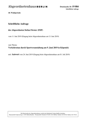 "content": "Drucksache 18 / 19 884 Schriftliche Anfrage 18. Wahlperiode Schriftliche Anfrage des Abgeordneten Stefan Förster (FDP) vom 11. Juni 2019 (Eingang beim Abgeordnetenhaus am 13. Juni 2019) zum Thema: Verkehrsstau durch Sportveranstaltung am 9. Juni 2019 in Köpenick und Antwort vom 24. Juni 2019 (Eingang beim Abgeordnetenhaus am 01. Juli 2019) Die Drucksachen des Abgeordnetenhauses sind bei der Kulturbuch-Verlag GmbH zu beziehen. Hausanschrift: Sprosserweg 3, 12351 Berlin-Buckow · Postanschrift: Postfach 47 04 49, 12313 Berlin, Telefon: 6 61 84 84; Telefax: 6 61 78 28.",