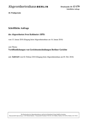 "content": "Drucksache 18 / 13 179 Schriftliche Anfrage 18. Wahlperiode Schriftliche Anfrage des Abgeordneten Sven Kohlmeier (SPD) vom 15. Januar 2018 (Eingang beim Abgeordnetenhaus am 16. Januar 2018) zum Thema: Veröffentlichungen von Gerichtsentscheidungen Berliner Gerichte und Antwort vom 02. Februar 2018 (Eingang beim Abgeordnetenhaus am 05. Feb. 2018) Die Drucksachen des Abgeordnetenhauses sind bei der Kulturbuch-Verlag GmbH zu beziehen. Hausanschrift: Sprosserweg 3, 12351 Berlin-Buckow · Postanschrift: Postfach 47 04 49, 12313 Berlin, Telefon: 6 61 84 84; Telefax: 6 61 78 28.",