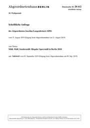 "content": "Drucksache 18 / 20 612 Schriftliche Anfrage 18. Wahlperiode Schriftliche Anfrage des Abgeordneten Joschka Langenbrinck (SPD) vom 15. August 2019 (Eingang beim Abgeordnetenhaus am 21. August 2019) zum Thema: Müll, Müll, Sondermüll: Illegaler Sperrmüll in Berlin 2018 und Antwort vom 03. September 2019 (Eingang beim Abgeordnetenhaus am 09. Sep. 2019) Die Drucksachen des Abgeordnetenhauses sind bei der Kulturbuch-Verlag GmbH zu beziehen. Hausanschrift: Sprosserweg 3, 12351 Berlin-Buckow · Postanschrift: Postfach 47 04 49, 12313 Berlin, Telefon: 6 61 84 84; Telefax: 6 61 78 28.",