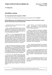 "content": "Drucksache 17 / 16 964 Schriftliche Anfrage 17. Wahlperiode Schriftliche Anfrage der Abgeordneten Katrin Lompscher (LINKE) vom 08. September 2015 (Eingang beim Abgeordnetenhaus am 09. September 2015) und Antwort Denkmalpflegerische und stadtplanerische Entwicklungen auf dem Gelände des Grauen Klosters und im Klosterviertel in Berlin-Mitte Im Namen des Senats von Berlin beantworte ich Ihre Frage 3: Wurden – wie in Drucksache 17/14703 dar- Schriftliche Anfrage wie folgt: gestellt – die Grabungen vor dem Wintereinbruch 2014/2015 verfüllt? Wenn nein, warum nicht und wann Frage 1: Inwiefern beabsichtigt der Senat, die bei der hat die Verfüllung stattgefunden? archäologischen Prospektion auf dem Gelände des Grauen Klosters bzw. des Gymnasiums zum Grauen Kloster in Antwort zu 3: Wegen der Insolvenz der archäologi- Berlin-Mitte gefundenen Bodendenkmale ganz oder teil- schen Grabungsfachfirma, die die Grabung durchführte weise unter Denkmalschutz zu stellen? und der mehrfach, wie im Falle von Leistungserbringung bei Werkverträgen üblich, Nachfristen für die Verfüllung Antwort zu 1: Das Landesdenkmalamt Berlin beab- der Grabungsflächen gesetzt wurden, erfolgte deren Ver- sichtigt die Ausweisung denkmalgeschützter Boden- füllung erst im Mai/Juni 2015 durch eine andere Firma. denkmale im Bereich des Grauen Klosters für die ergra- Vorsorglich hatte das Landesdenkmalamt Berlin im No- benen Fundamente des Kreuzgangs des Klosters und des vember 2014 mit Unterstützung von Bundesfreiwilligen Kapitelsaals. Darüber hinaus ist beabsichtigt, mit der das freiliegende Mauerwerk mit einer schützenden Sand- unter Denkmalschutz stehenden Ruine der Franziskaner- aufschüttung versehen. Mittlerweile ist der ursprüngliche klosterkirche ein Denkmalensemble auszubilden, das den Zustand der öffentlichen Grünfläche, in der die Grabung gesamten Bereich des Grauen Klosters, der als archäolo- durchgeführt wurde, wiederhergestellt. gisches Verdachtsgebiet ausgewiesen ist, einschließt. Frage 4: Welche Beeinträchtigungen und Schädigun- Frage 2: Der Senat meinte gemäß Antwort zu Frage 4 gen der Bodendenkmalstrukturen sind nach dem zurück- der Drucksache 17/14703 eine regelmäßige und öffentli- liegenden Winter eingetreten und wie werden diese ggf. che Begehbarkeit der vorübergehend freiliegenden Gra- behoben? bungen aus Kostengründen nicht einrichten zu können – warum hatte die (Fach)Öffentlichkeit jedoch überhaupt Antwort zu 4: Das Landesdenkmalamt Berlin hat die keine Möglichkeit, die vom Landesdenkmalamt freigeleg- Verfüllung der Grabungsflächen begleitet, dabei, sicher- ten Bodendenkmalstrukturen des Grauen Klosters bzw. lich auch aufgrund des milden Winters 2014/15, keinerlei des Gymnasiums zum Grauen Kloster zu besichtigen? zusätzliche Schäden am Mauerwerk festgestellt, so dass keine zusätzlichen Sicherungsmaßnahmen erforderlich Antwort zu 2: Das Landesdenkmalamt Berlin ermög- waren. lichte auf Nachfrage eine Reihe von Grabungsführungen. Beispielsweise wurden am Tag des offenen Denkmals am 13.09.2014 die Stiftung Berlinisches Gymnasium zum Frage 5: Welche Möglichkeiten bestehen für die Öf- Grauen Kloster und der Förderverein des Evangelischen fentlichkeit, die geborgenen mobilen Funde in Augen- Gymnasiums zum Grauen Kloster - Berlinisches Gymna- schein zu nehmen bzw. welche sind in welchen Zeiträu- sium in Berlin-Mitte e.V. mit insgesamt ca. 50 Personen men geplant? geführt. Am 25.09.2014 wurden die ehrenamtlichen Bo- dendenkmalpfleger Berlins, insgesamt ca. 20 Personen, geführt. Die Drucksachen des Abgeordnetenhauses sind bei der Kulturbuch-Verlag GmbH zu beziehen. Hausanschrift: Sprosserweg 3, 12351 Berlin-Buckow · Postanschrift: Postfach 47 04 49, 12313 Berlin, Telefon: 6 61 84 84; Telefax: 6 61 78 28.",