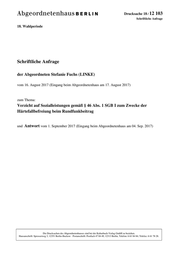 "content": "Drucksache 18 / 12 103 Schriftliche Anfrage 18. Wahlperiode Schriftliche Anfrage der Abgeordneten Stefanie Fuchs (LINKE) vom 16. August 2017 (Eingang beim Abgeordnetenhaus am 17. August 2017) zum Thema: Verzicht auf Sozialleistungen gemäß § 46 Abs. 1 SGB I zum Zwecke der Härtefallbefreiung beim Rundfunkbeitrag und Antwort vom 1. September 2017 (Eingang beim Abgeordnetenhaus am 04. Sep. 2017) Die Drucksachen des Abgeordnetenhauses sind bei der Kulturbuch-Verlag GmbH zu beziehen. Hausanschrift: Sprosserweg 3, 12351 Berlin-Buckow · Postanschrift: Postfach 47 04 49, 12313 Berlin, Telefon: 6 61 84 84; Telefax: 6 61 78 28.",