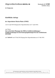 "content": "Drucksache 18 / 14 860 Schriftliche Anfrage 18. Wahlperiode Schriftliche Anfrage der Abgeordneten Marion Platta (LINKE) vom 26. April 2018 (Eingang beim Abgeordnetenhaus am 27. April 2018) zum Thema: Gut vorbereitete Planungen der BSR zu Gebührenerhöhungen / Gebührensenkungen bei den Entsorgungsleistungen für den Tarifzeitraum 2019/2020 und Antwort vom 07. Mai 2018 (Eingang beim Abgeordnetenhaus am 15. Mai 2018) Die Drucksachen des Abgeordnetenhauses sind bei der Kulturbuch-Verlag GmbH zu beziehen. Hausanschrift: Sprosserweg 3, 12351 Berlin-Buckow · Postanschrift: Postfach 47 04 49, 12313 Berlin, Telefon: 6 61 84 84; Telefax: 6 61 78 28.",