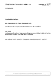 "content": "Drucksache 18 / 11 977 Schriftliche Anfrage 18. Wahlperiode Schriftliche Anfrage des Abgeordneten Dr. Dieter Neuendorf (AfD) vom 08. August 2017 (Eingang beim Abgeordnetenhaus am 09. August 2017) zum Thema: Anfrage zum Besuch des Regierenden Bürgermeisters Michael Müller in Berlins Partnerstadt Moskau vom 13.03.2017-15.03.2017 und Antwort vom 28. August 2017 (Eingang beim Abgeordnetenhaus am 29. Aug. 2017) Die Drucksachen des Abgeordnetenhauses sind bei der Kulturbuch-Verlag GmbH zu beziehen. Hausanschrift: Sprosserweg 3, 12351 Berlin-Buckow · Postanschrift: Postfach 47 04 49, 12313 Berlin, Telefon: 6 61 84 84; Telefax: 6 61 78 28.",