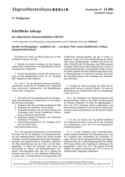"content": "Drucksache 17 / 14 486 Schriftliche Anfrage 17. Wahlperiode Schriftliche Anfrage der Abgeordneten Susanna Kahlefeld (GRÜNE) vom 02. September 2014 (Eingang beim Abgeordnetenhaus am 04. September 2014) und Antwort Bezahlt wie Botengänger – qualifiziert wie … was denn? Über welche Qualifikation verfügen Integrationslots*innen? Im Namen des Senats von Berlin beantworte ich Ihre Fachdiensten weiterzuvermitteln und ggf. zu diesen zu Schriftliche Anfrage wie folgt: begleiten, werden in der Basis-Qualifizierung die Grund- lagen dieser Handlungsfelder vermittelt und jeweils mit 1. Erwartet die Senatsverwaltung von den Integrati- einem Überblick über die Beratungs- und Hilfestrukturen onslots*innen Fachkenntnisse und Qualifikationen für die verknüpft. Ergänzend zur Basis-Qualifizierung werden im Ausübung ihrer Tätigkeiten? Landesrahmenprogramm Zusatzqualifizierungen angebo- ten. Diese ergänzen die Basis-Qualifizierung durch weite- 2. Welche Fachkenntnisse erwartet die Senatsverwal- re Themenangebote, aus denen die Lotsinnen und Lotsen tung von den Integrationslots*innen für die Ausübung frei auswählen können (z.B. Grundlagen des Ausländer- ihrer Tätigkeiten? (bitte auflisten) und Asylrechts). Zu 1. und 2.: Von den Integrationslotsinnen und Integ- rationslotsen werden für die Ausübung ihrer Tätigkeiten 4. Erachtet die Senatsverwaltung die Arbeit der In- keine spezifischen Fachkenntnisse und Qualifikationen tegrationslots*innen als „einfache Tätigkeit“ im Sinne der erwartet oder vorausgesetzt. Beschreibung der Tätigkeitsmerkmale der Entgeltgruppe 2 und 3 des TV-L? 3. Sind neben der Sprachmittlung und den dazugehö- Zu 4.: Die Tätigkeiten der Integrationslotsinnen und rigen Sprachkenntnissen, Fachkenntnisse in den folgen- Integrationslotsen werden in der Regel und überwiegend den Bereichen notwendig? als einfache Tätigkeiten im Sinne der Entgeltgruppen 2 a. Kenntnisse über die verschiedenen Bände des SGB und 3 des TV-L betrachtet. Davon ausgenommen sind b. Kenntnisse des Ausländer- und Asylrechts koordinierende Tätigkeiten in den Teams der Integrations- c. strukturelle Kenntnisse der jeweiligen Bezirke, der lotsinnen und Integrationslotsen, die abweichend vergütet Verwaltung sowie weiterer Institutionen, Einrich- werden. tungen und Gremien der Bezirke d. Kenntnisse bezüglich Formularen und Vordrucken der Berliner Verwaltung 5. In wie viel Prozent der Angestelltenverhältnisse e. Unterstützungsangebote für die vielfältigen Prob- der Integrationslots*innen wurde sich bei der Vergütung leme der Klient*innen an die Entgeltstufe 2 und 3 des TV-L laut Programmaus- (bitte einzeln beantworten). schreibung gehalten? Zu 3.: Die genannten Fachkenntnisse in den einzelnen Zu 5.: In den Unterlagen zum Landesrahmenpro- Bereichen sind für die Tätigkeiten der Integrationslotsin- gramm Integrationslotsinnen und Integrationslotsen wird nen und Integrationslotsen wichtig und werden deshalb die Vergütung nach Entgeltstufen nur beispielhaft er- im Rahmen einer Basisqualifizierung für alle Integrations- wähnt. Derzeit sind 69 Integrationslotsinnen und Integra- lotsinnen und Integrationslotsen verbindlich angeboten. tionslotsen über das Landesrahmenprogramm beschäftigt. Die Basis-Qualifizierung legt den Fokus auf die Hand- 55 Personen erhalten eine Vergütung in Anlehnung an die lungsfelder, in denen die Lotsinnen und Lotsen im Entgeltstufen 2 und 3 des TV-L. Die übrigen Personen Schwerpunkt als Sprach- und Kulturmittlerinnen bzw. erhalten eine höhere Vergütung nach TV-L 7-10, da sie Sprach- und Kulturmittler tätig sind. Da es Aufgabe der koordinierende Tätigkeiten wahrnehmen. Lotsinnen und Lotsen ist, erste aufklärende Hilfestellung zu geben und zu fachspezifischen Beratungsstellen und Die Drucksachen des Abgeordnetenhauses sind bei der Kulturbuch-Verlag GmbH zu beziehen. Hausanschrift: Sprosserweg 3, 12351 Berlin-Buckow · Postanschrift: Postfach 47 04 49, 12313 Berlin, Telefon: 6 61 84 84; Telefax: 6 61 78 28.",