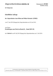 "content": "Drucksache 18 / 20 062 Schriftliche Anfrage 18. Wahlperiode Schriftliche Anfrage der Abgeordneten Anne Helm und Niklas Schrader (LINKE) vom 27. Juni 2019 (Eingang beim Abgeordnetenhaus am 28. Juni 2019) zum Thema: Ermittlungen zum Mord an Burak B. – Stand 2019 (II) und Antwort vom 09. Juli 2019 (Eingang beim Abgeordnetenhaus am 15. Juli 2019) Die Drucksachen des Abgeordnetenhauses sind bei der Kulturbuch-Verlag GmbH zu beziehen. Hausanschrift: Sprosserweg 3, 12351 Berlin-Buckow · Postanschrift: Postfach 47 04 49, 12313 Berlin, Telefon: 6 61 84 84; Telefax: 6 61 78 28.",
