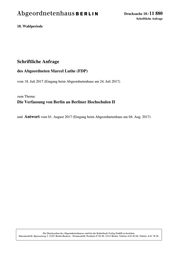 "content": "Drucksache 18 / 11 880 Schriftliche Anfrage 18. Wahlperiode Schriftliche Anfrage des Abgeordneten Marcel Luthe (FDP) vom 18. Juli 2017 (Eingang beim Abgeordnetenhaus am 24. Juli 2017) zum Thema: Die Verfassung von Berlin an Berliner Hochschulen II und Antwort vom 01. August 2017 (Eingang beim Abgeordnetenhaus am 04. Aug. 2017) Die Drucksachen des Abgeordnetenhauses sind bei der Kulturbuch-Verlag GmbH zu beziehen. Hausanschrift: Sprosserweg 3, 12351 Berlin-Buckow · Postanschrift: Postfach 47 04 49, 12313 Berlin, Telefon: 6 61 84 84; Telefax: 6 61 78 28.",